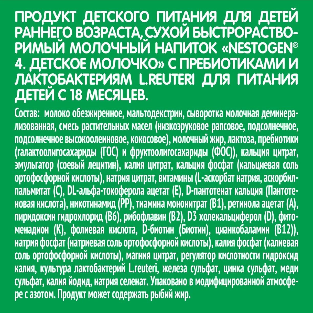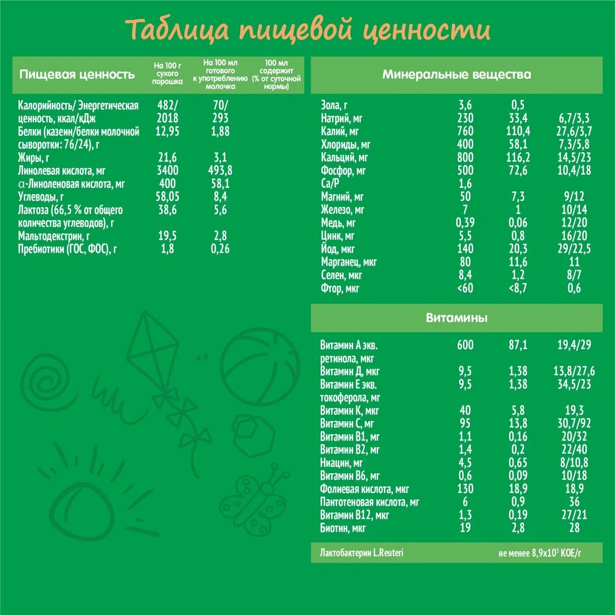 | Состав | обезжиренное молоко, мальтодекстрин,сыворотка молочная деминерализованная, смесь растительных масел (низкоэруковое рапсовое, подсолнечное, подсолнечное высокоолеиновое, кокосовое), молочный жир, лактоза, пребиотики (галактоолигосахариды (ГОС) и фруктоолигосахариды (ФОС)), цитрат кальция, эмульгатор (соевый лецитин), цитрат калия, фосфат кальция, цитрат натрия, витамины, фосфат натрия, фосфат калия, цитрат магния, регулятор кислотности гидроксид калия,культура лактобактерий L. reuteri (не менее 8,9х10^5 КОЕ/г), сульфат железа, сульфат цинка, сульфат меди, йодид калия, селенат натрия |
