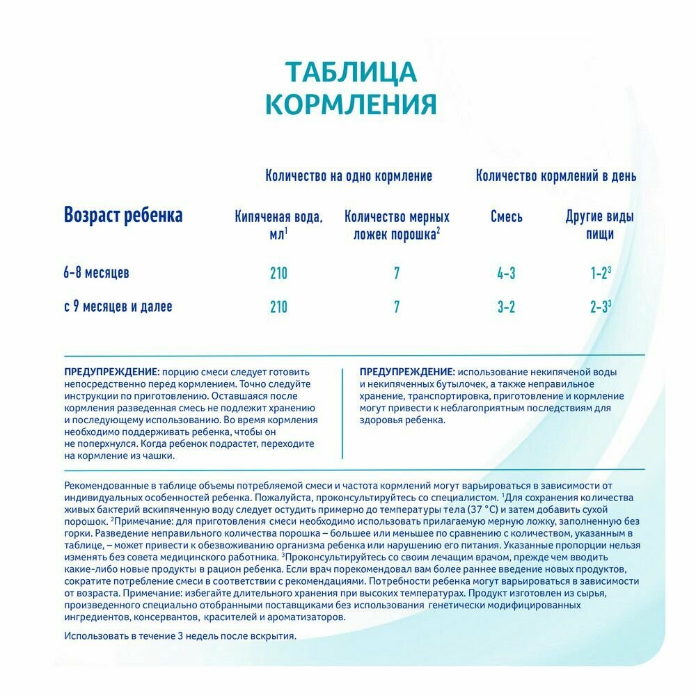 | Дополнительная информация | порцию смеси следует готовить непосредственно перед кормлением; точно следуйте инструкции по приготовлению; оставшаяся после кормления разведенная смесь не подлежит хранению и последующему использованию; до и после вскрытия хранить при температуре не выше 25 °С и относительной влажности воздуха не более 75%; содержимое банки должно быть использовано в течение 3-х недель после вскрытия, не рекомендуется хранить в холодильнике; дата изготовления (MAN), годен до (EXP) и номер партии указаны на дне банки |