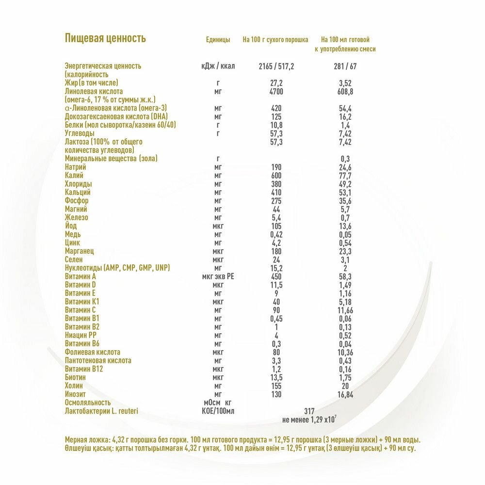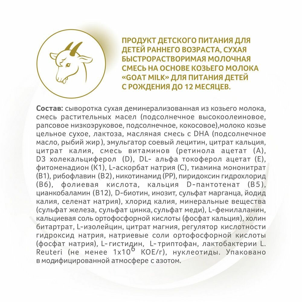 | Состав | сыворотка сухая деминерализованная из козьего молока, смесь растительных масел (подсолнечное высокоолеиновое, рапсовое низкоэруковое, подсолнечное, кокосовое), молоко козье цельное сухое, лактоза, масляная смесь с DHA (подсолнечное масло, рыбий жир), эмульгатор соевый лецитин, цитрат кальция, цитрат калия, хлорид калия, L-фенилаланин, кальциевая соль ортофосфорной кислоты (фосфат кальция), холин битартрат, L-изолейцин, цитрат магния, регулятор кислотности гидроксид натрия, натриевые соли ортофосфорной кислоты (фосфат натрия), L-гистидин, L-триптофан, лактобактерии L. Reuteri (не менее 1х106 КОЕ/г), нуклеотиды |