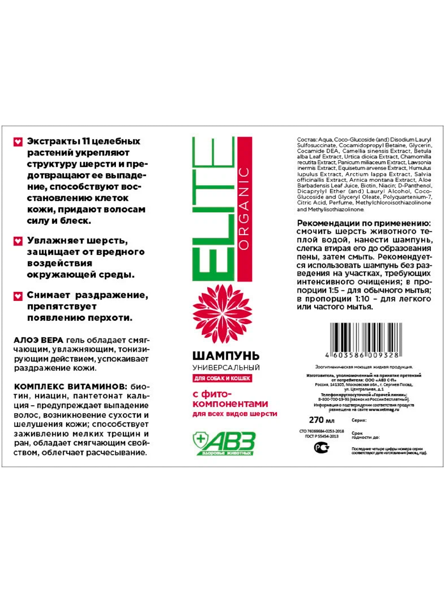 Шампунь для собак и кошек elite organic универсальный 270мл авз