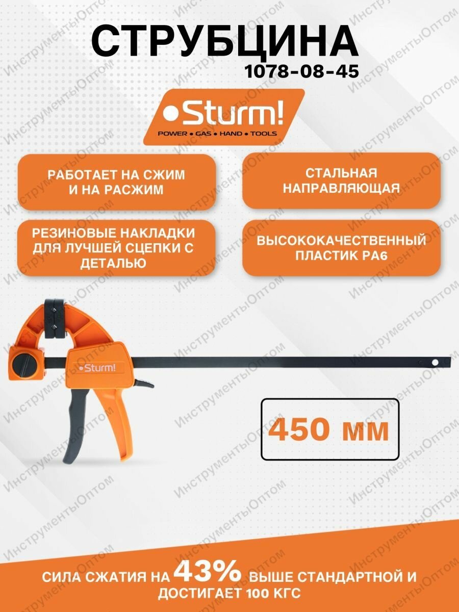 Купить Струбцина быстрозажимная Sturm! 1078-08-45, 450мм, резиновые накладки, 70-100кгс, сжим-разжим 1078-0 .