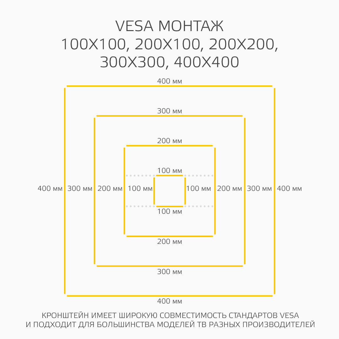 | Стандарт Vesa | 100x100 мм / 100x200 мм / 100х400 мм / 200x100 мм / 200x200 мм / 200x300 мм / 200x400 мм / 300x100 мм / 300x200 мм / 300x300 мм / 300x400 мм / 400x100 мм / 400x200 мм / 400x300 мм / 400x400 мм / 75x75 мм |