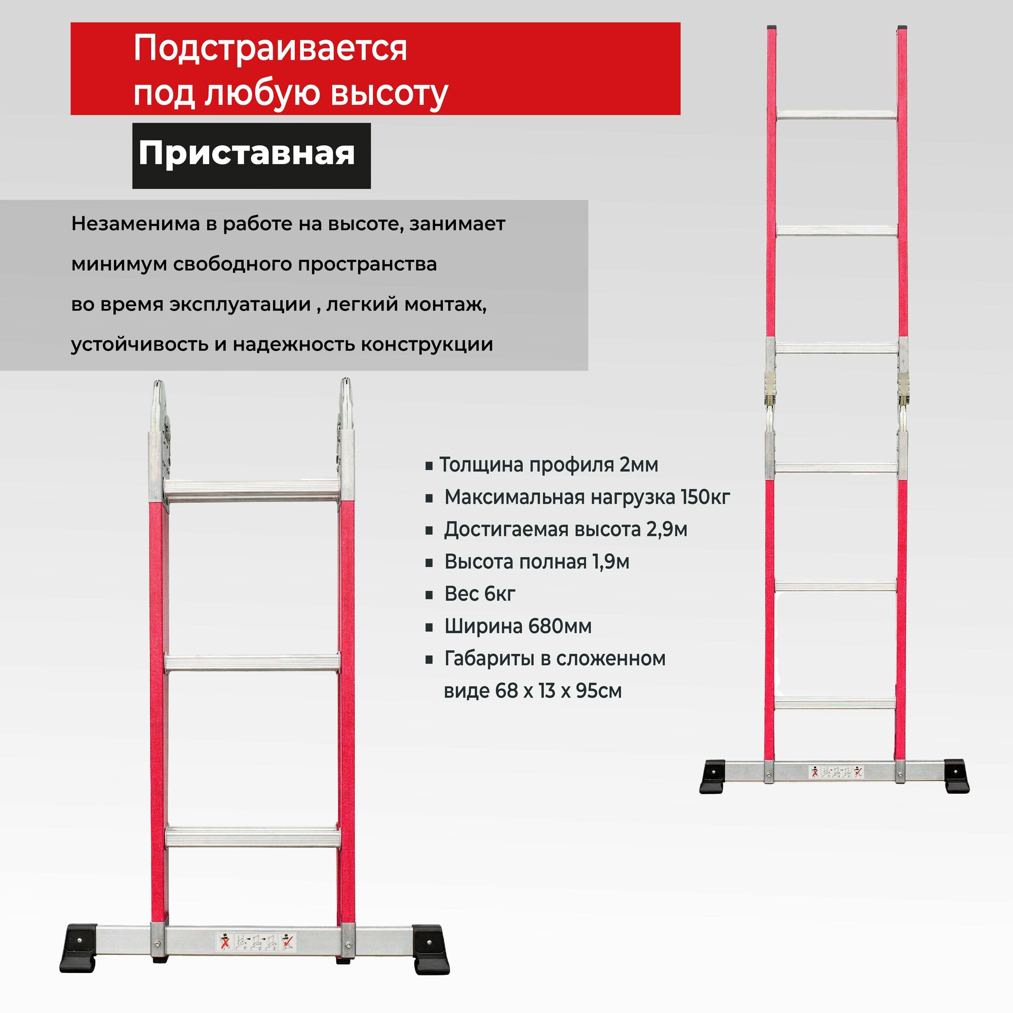 Новая высота Лестница-трансформер 3-х секционная 3×7 ступеней, 3×1,9 м, высота 4,5 м, нагрузка 150 кг, алюминий, новая высота