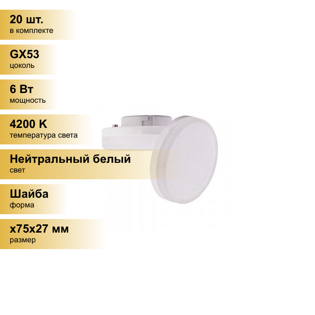 Сохранить(20 шт.) Светодиодная лампочка Ecola GX53 св/д 6W 4200K 4K 27x75 матов. T5QV60ELC Нейтральный белый. Цоколь GX53 интересное: