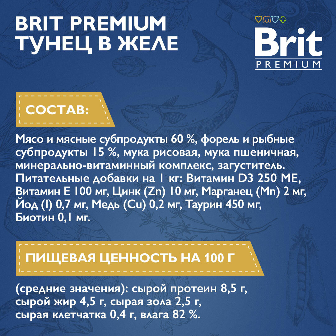 BRIT Premium Cat Adult Корм влаж.тунец в желе д/кошек пауч 85г интересное: