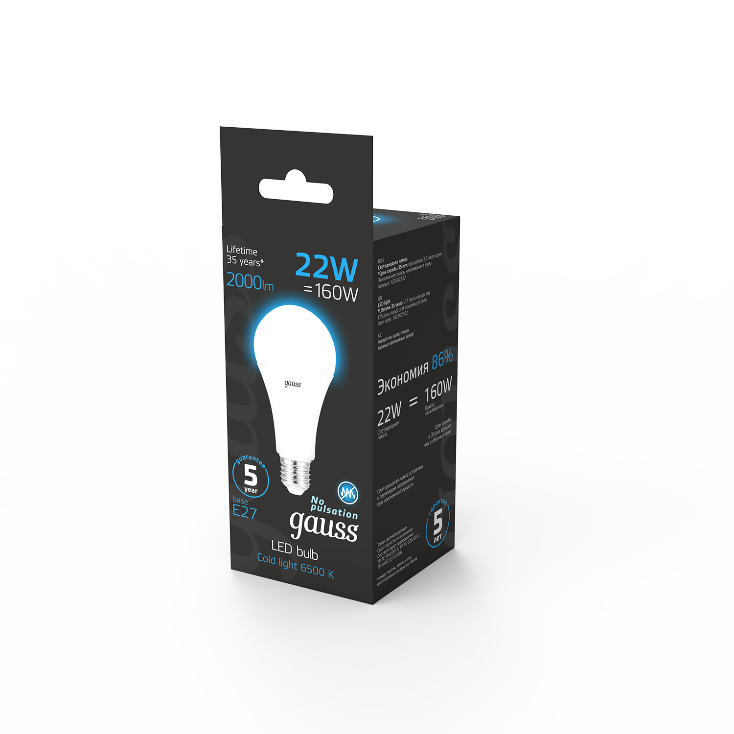 Лампа светодиодная Black 22Вт A70 6500К холод. бел. E27 2000лм | код.102502322 | GAUSS (10шт.в упак.)