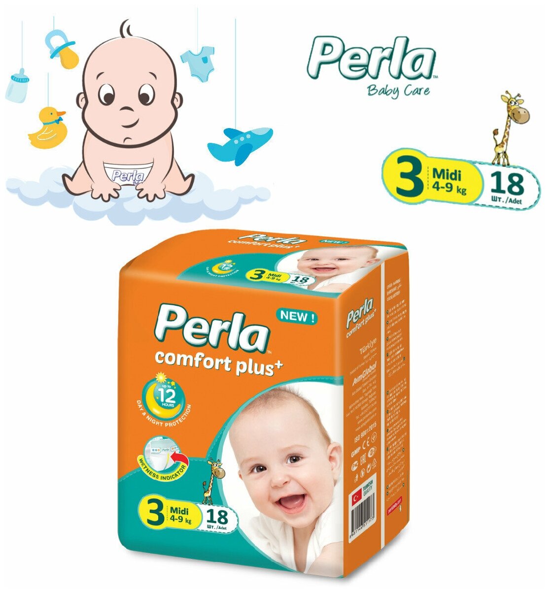 Купить Подгузники Perla Eco Midi для малышей 4-9 кг, 3 размер, 18 шт, экономичная упаковка, для мальчиков и девочек, Турция