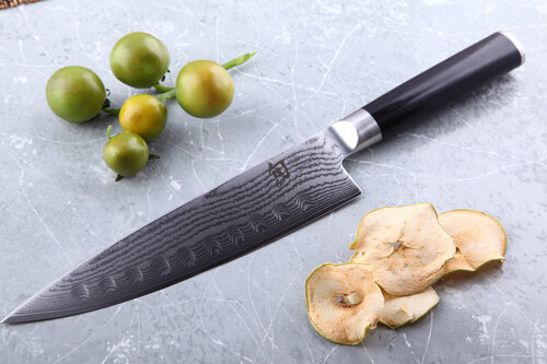 Нож кухонный поварской гюйто из дамасской стали с углублениями на лезвии, 21.6 см, рукоять из стабилизированной древесины, черный, серия Shun Classic, Kai, KAI-DM-0719