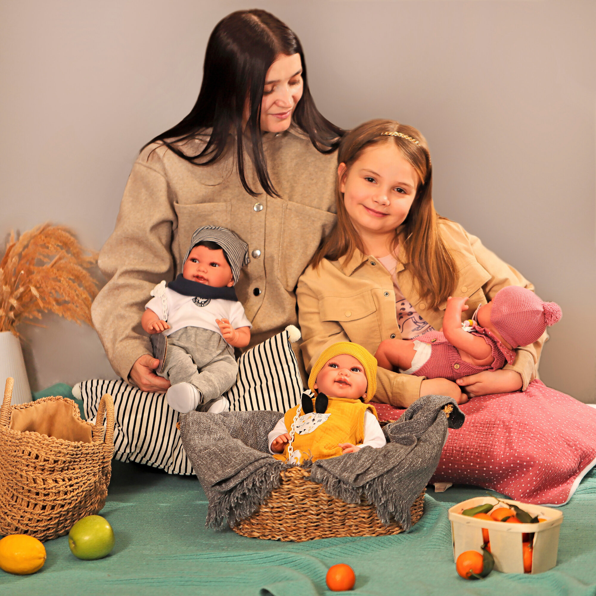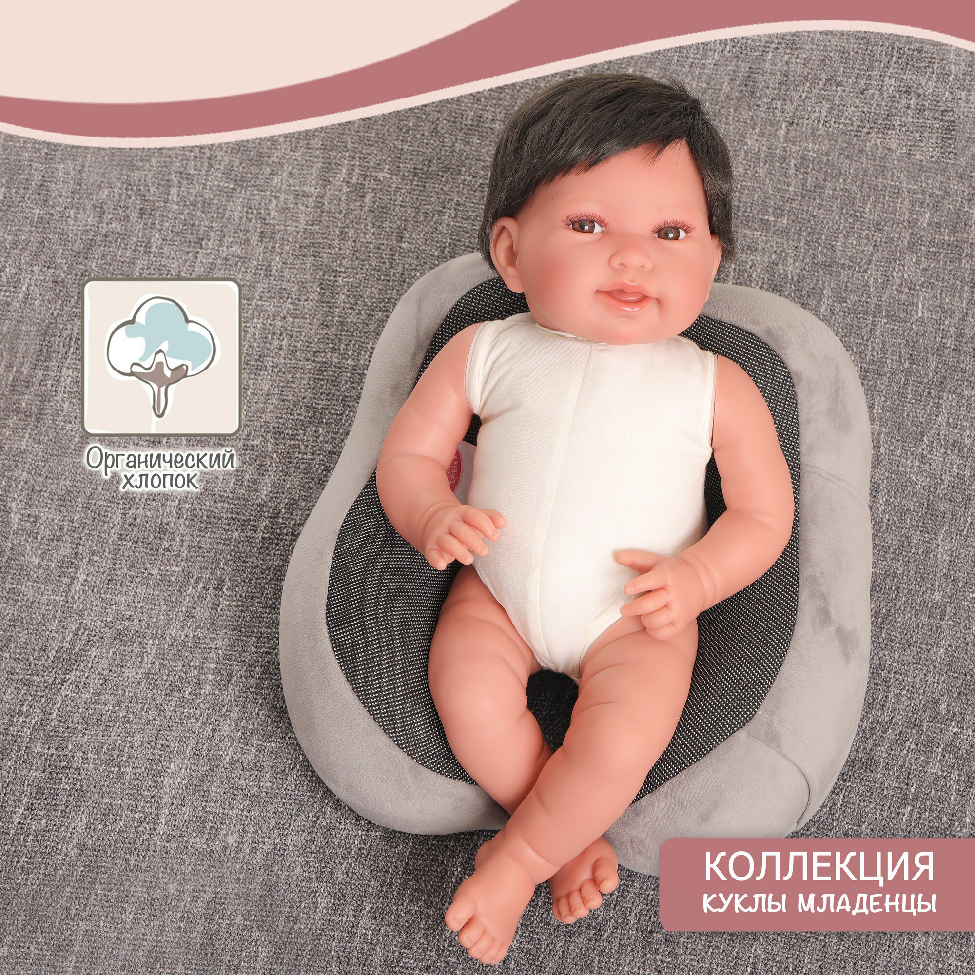 Пупс "Recién Nacida con cojín y chaqueta" (Малышка в серой куртке с подушкой)
