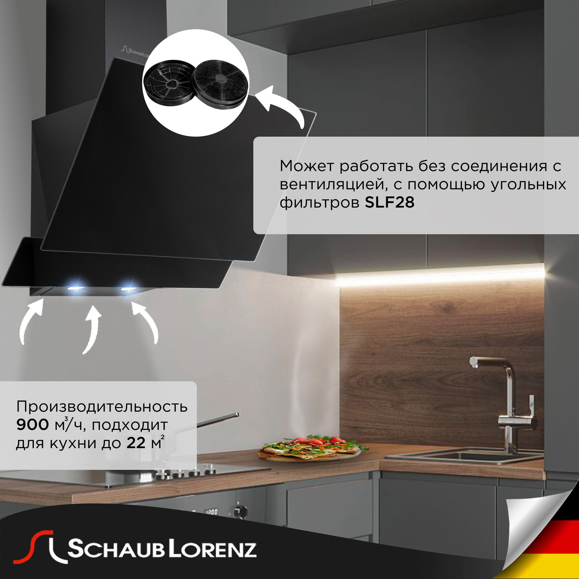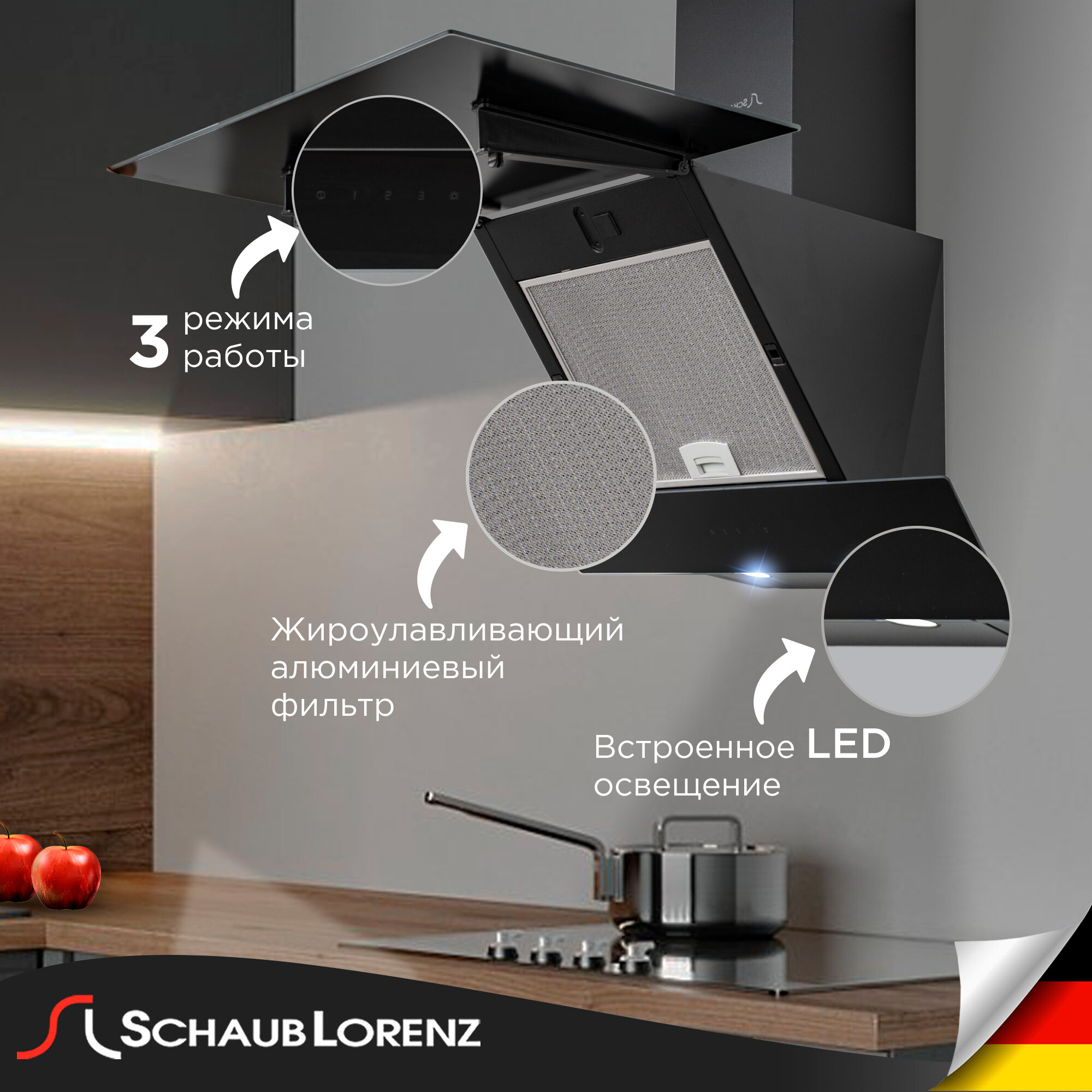 Вытяжка кухонная наклонная Schaub Lorenz SLD DY6430, 60 см, 3 скорости, черное стекло интересное: