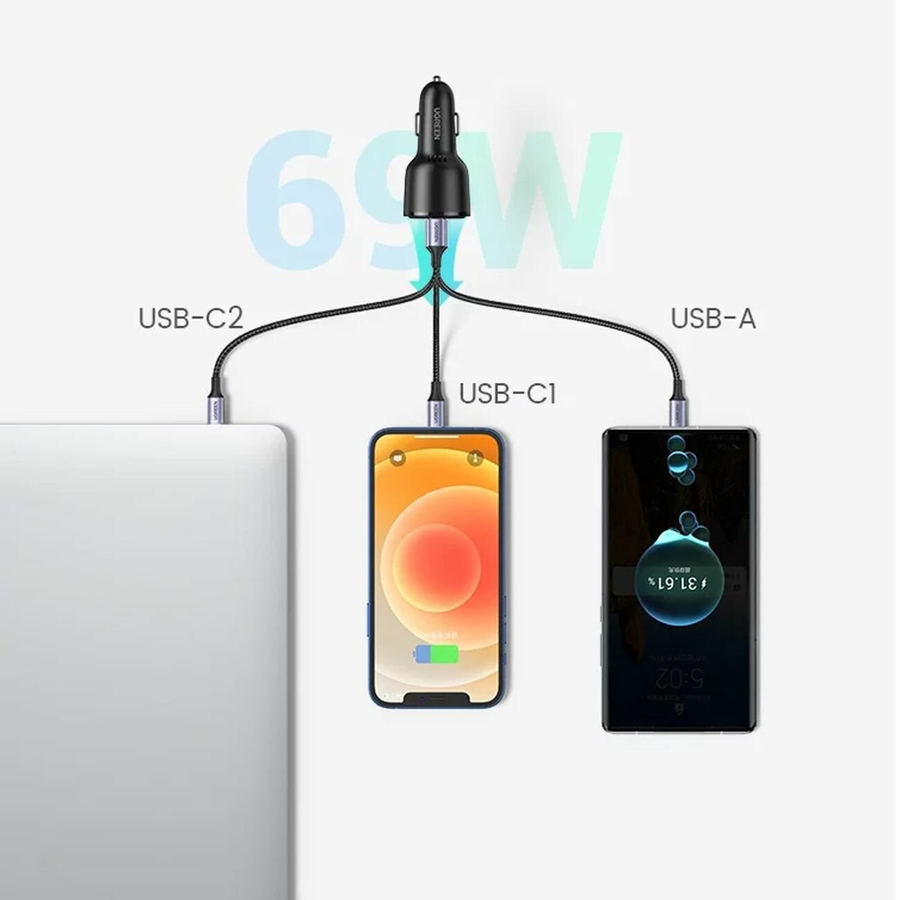 Автомобильное быстрое зарядное устройство UGREEN CD239 (20467) 2*USB-C PD+USB-A 69W Car Charger 69W Max. Цвет: черный