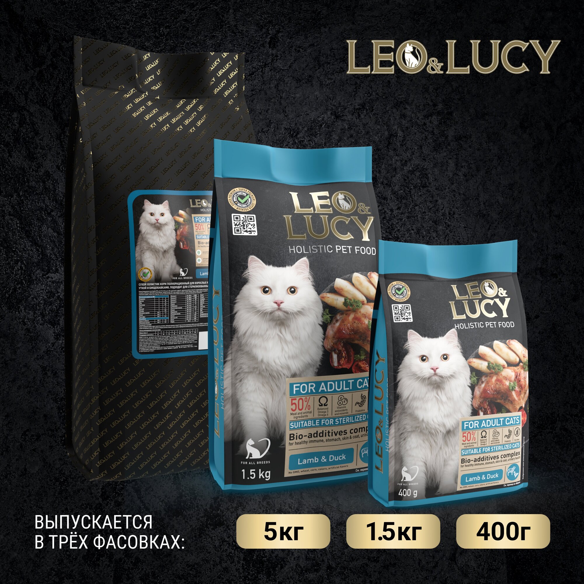 LEO&LUCY сухой холистик корм полнорационный для взрослых кошек с ягненком, уткой и биодобавками, подходит для стерилизованных, 1,5 кг