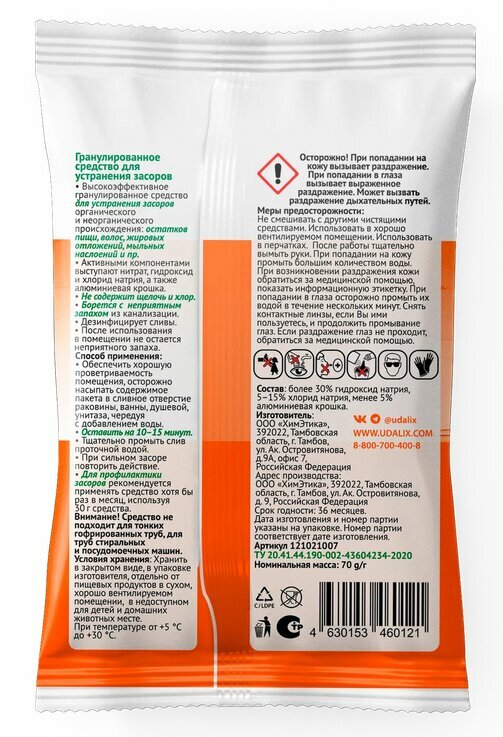 Udalix средство для удаления засоров в трубах 70 гр