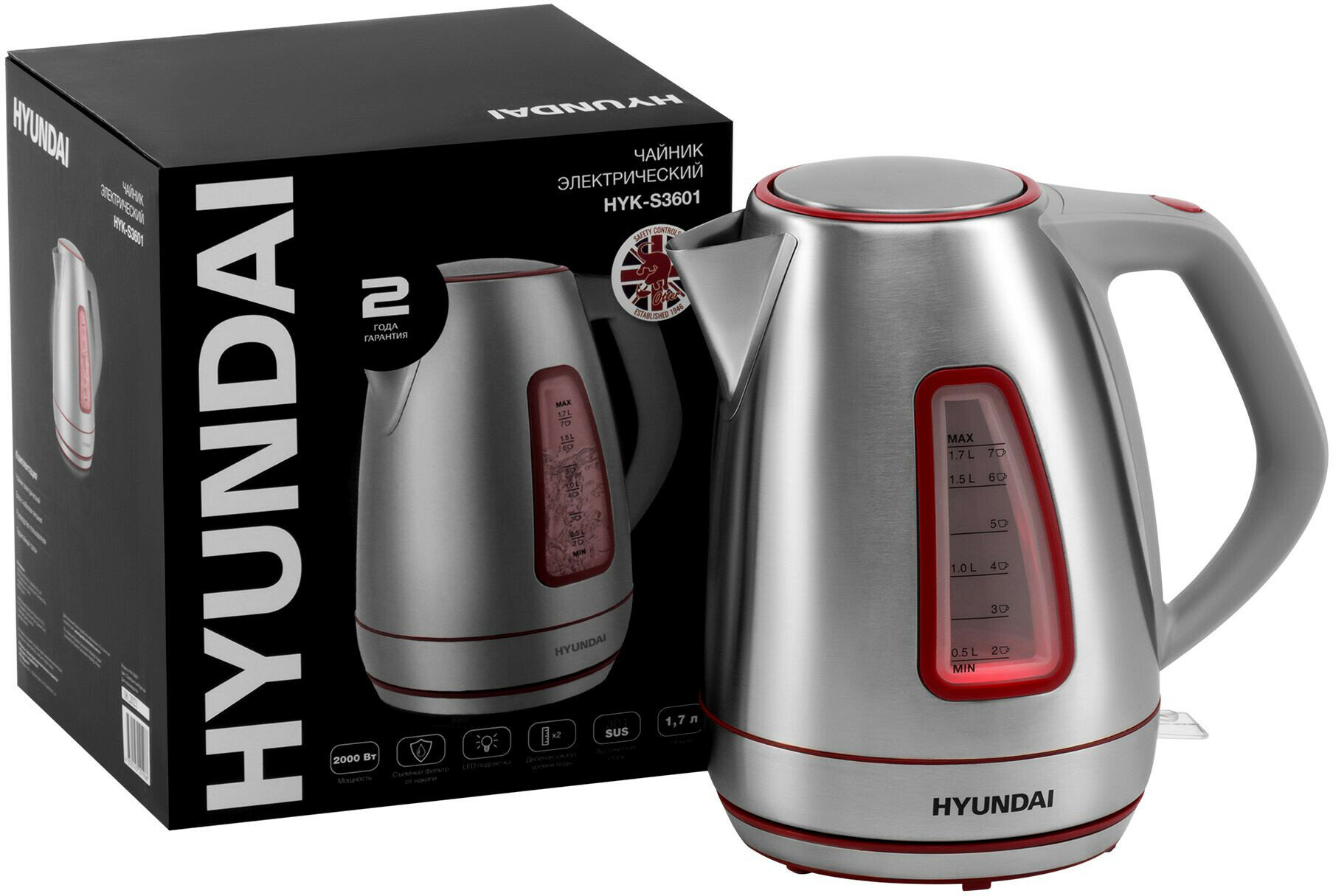 Чайник электрический Hyundai HYK-S3601 серебристый/красный (нержавеющая сталь)