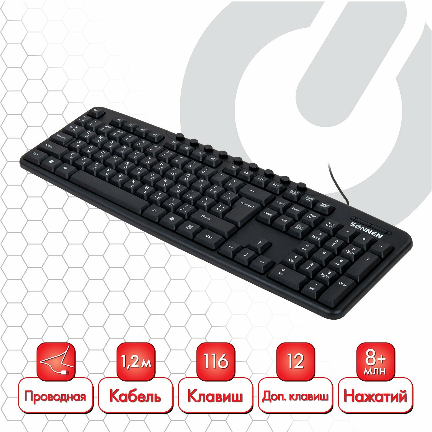 Клавиатура Sonnen проводная KB-8137, USB, 104 клавиши, 12 дополнительных, черная 512652