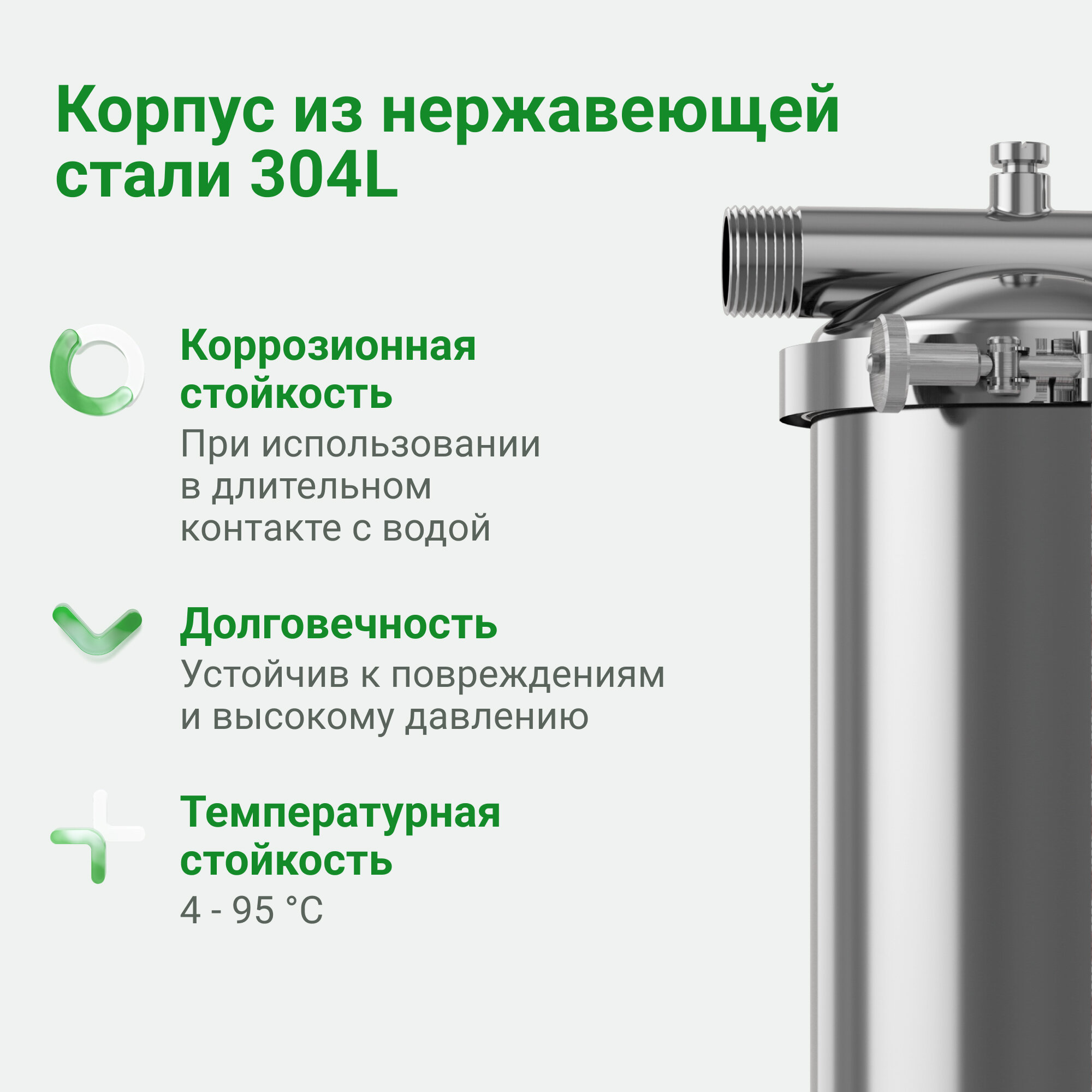 | Дополнительная информация | выполнен из нержавеющей стали марки 304L, используется с картриджами стандарта Slim Line 10", при первичной установке или в случае замены картриджа требуется оставить внизу свободное место не менее 2/3 от высоты колбы; макс. температура воды на входе: 95 °C; мин. температура воды на входе: 4 °C; макс. давление на входе: 8 атм; рекомендуемая производительность: 30 л/мин |