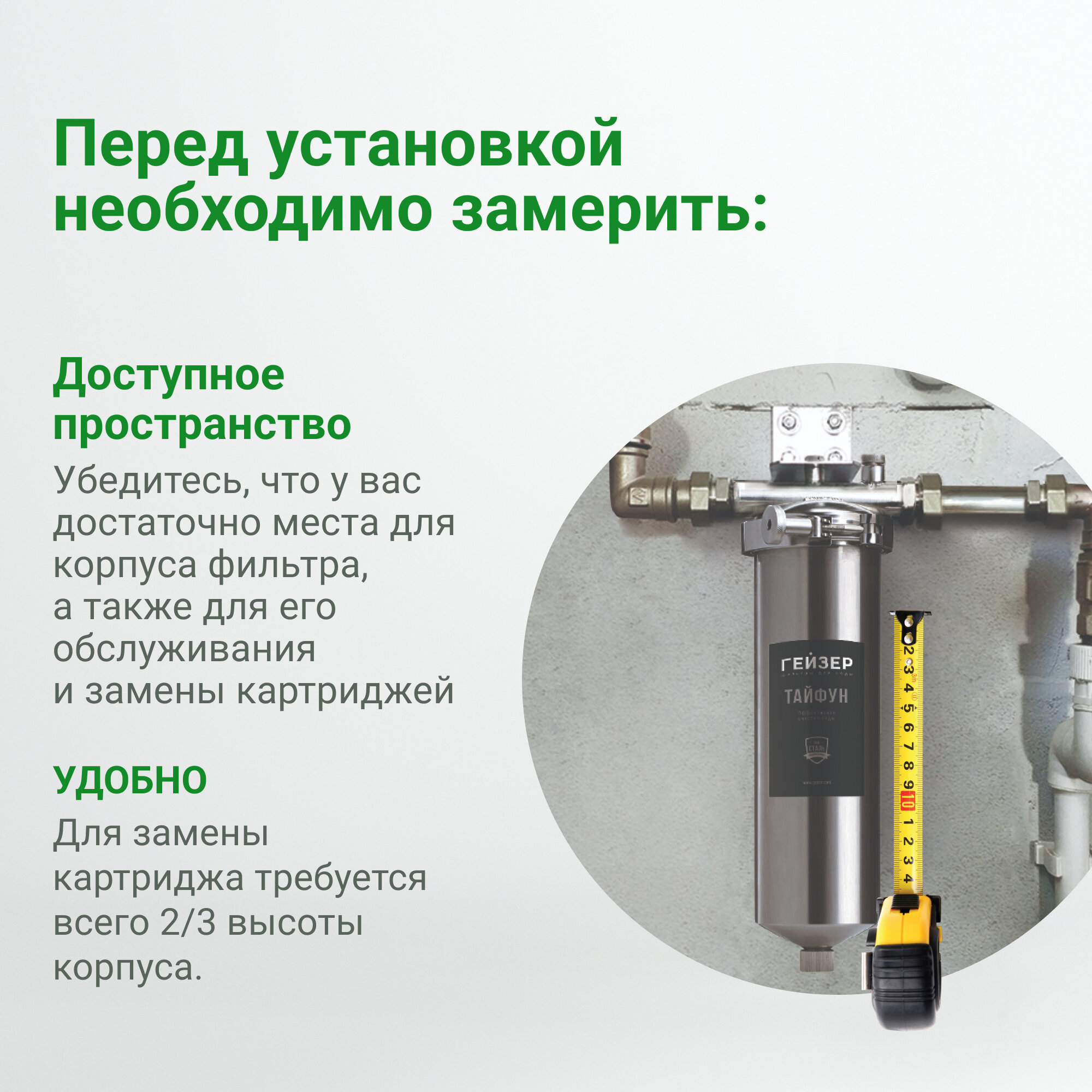 Поставил в сантехническом блоке и забыл на пол года. Удобно менять фильтры. |