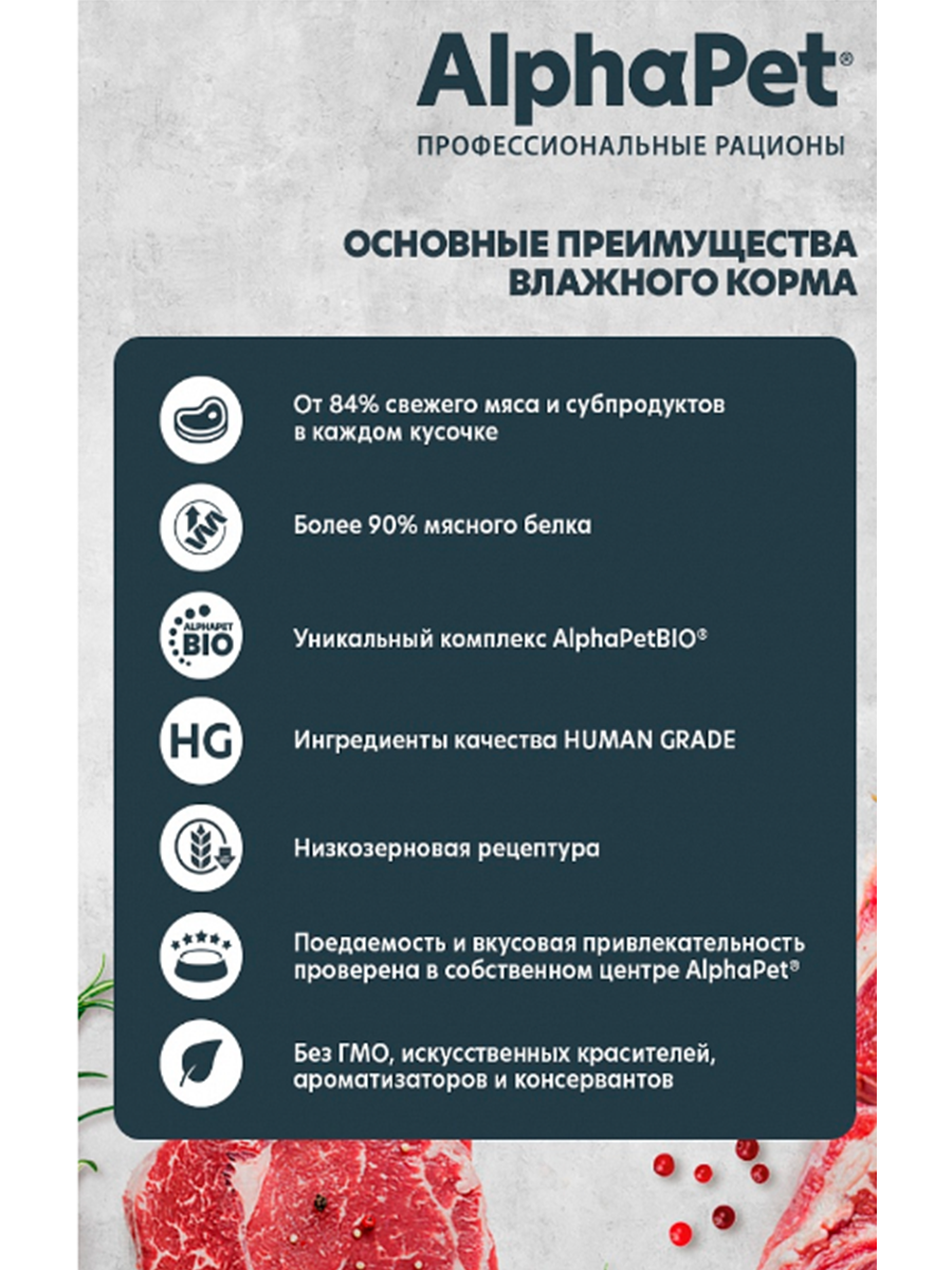 СохранитьВлажный корм для собак с чувств. пищеварением AlphaPet Superpremium Телятина и тыква мясные кусочки в соусе 100г (в упаковке 15 блистеров) интересное: