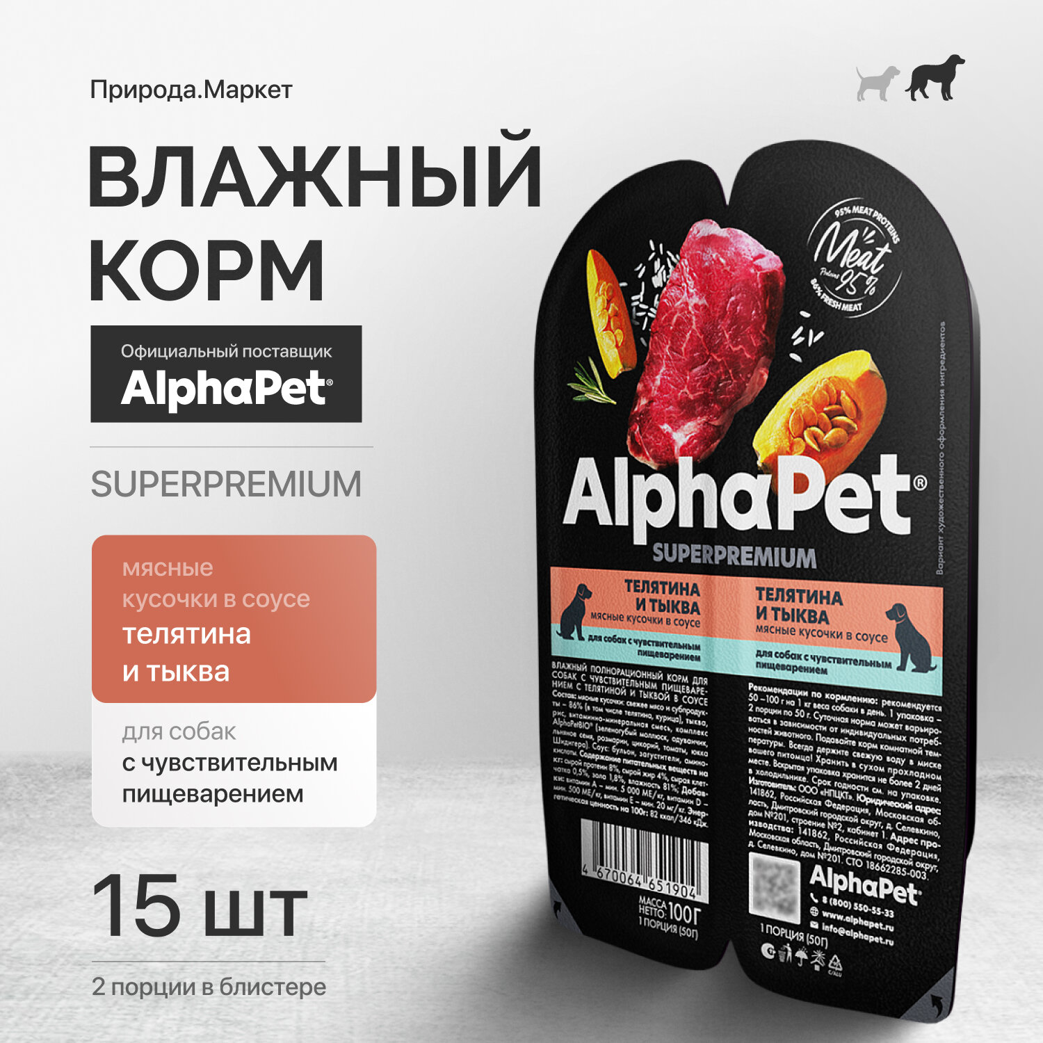 AlphaPet Влажный корм Телятина и тыква 100г 15 штук