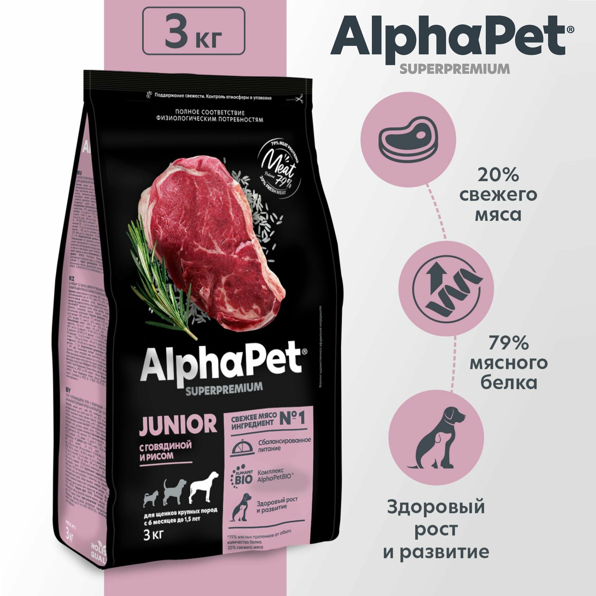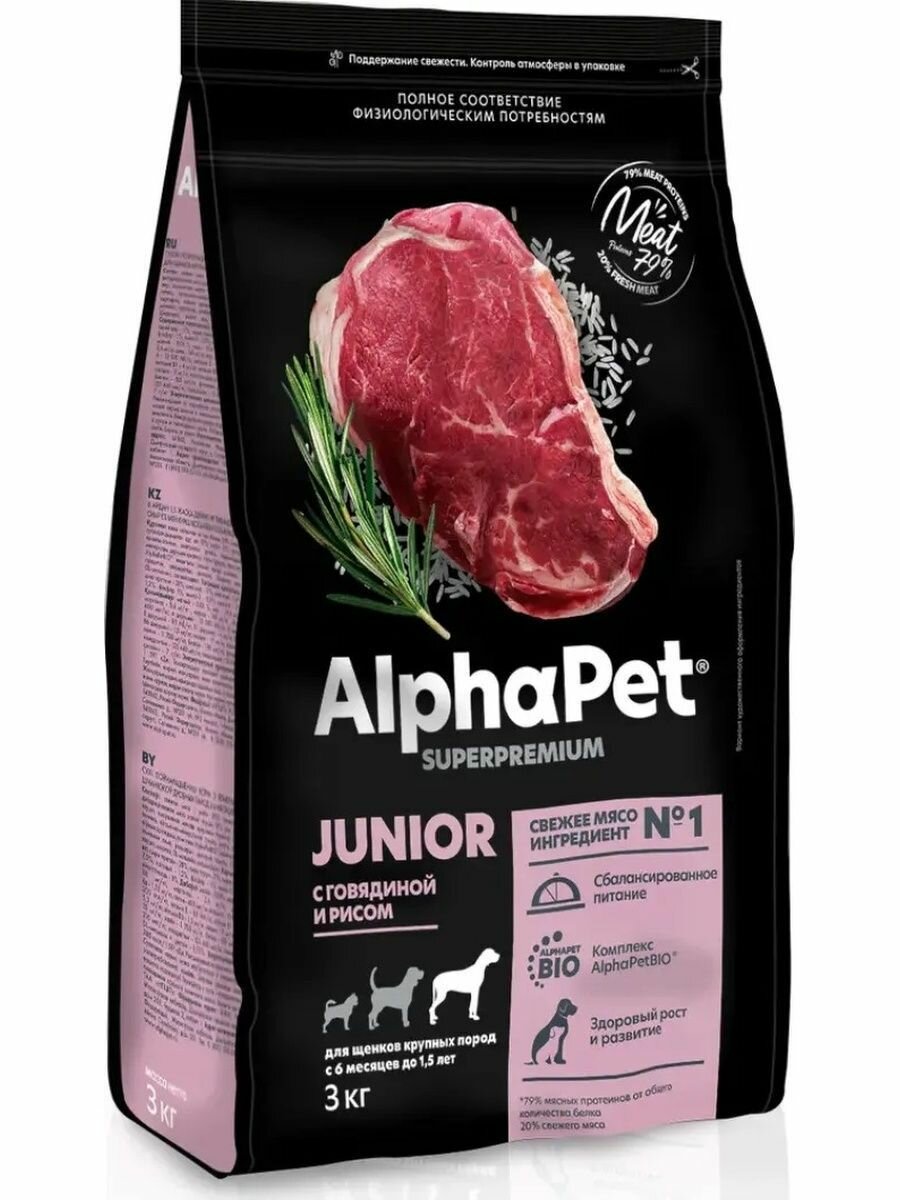 AlphaPet Superpremium - Сухой корм для щенков крупных пород с 6 месяцев до 1.5 лет, с Говядиной и Рисом (3 кг)