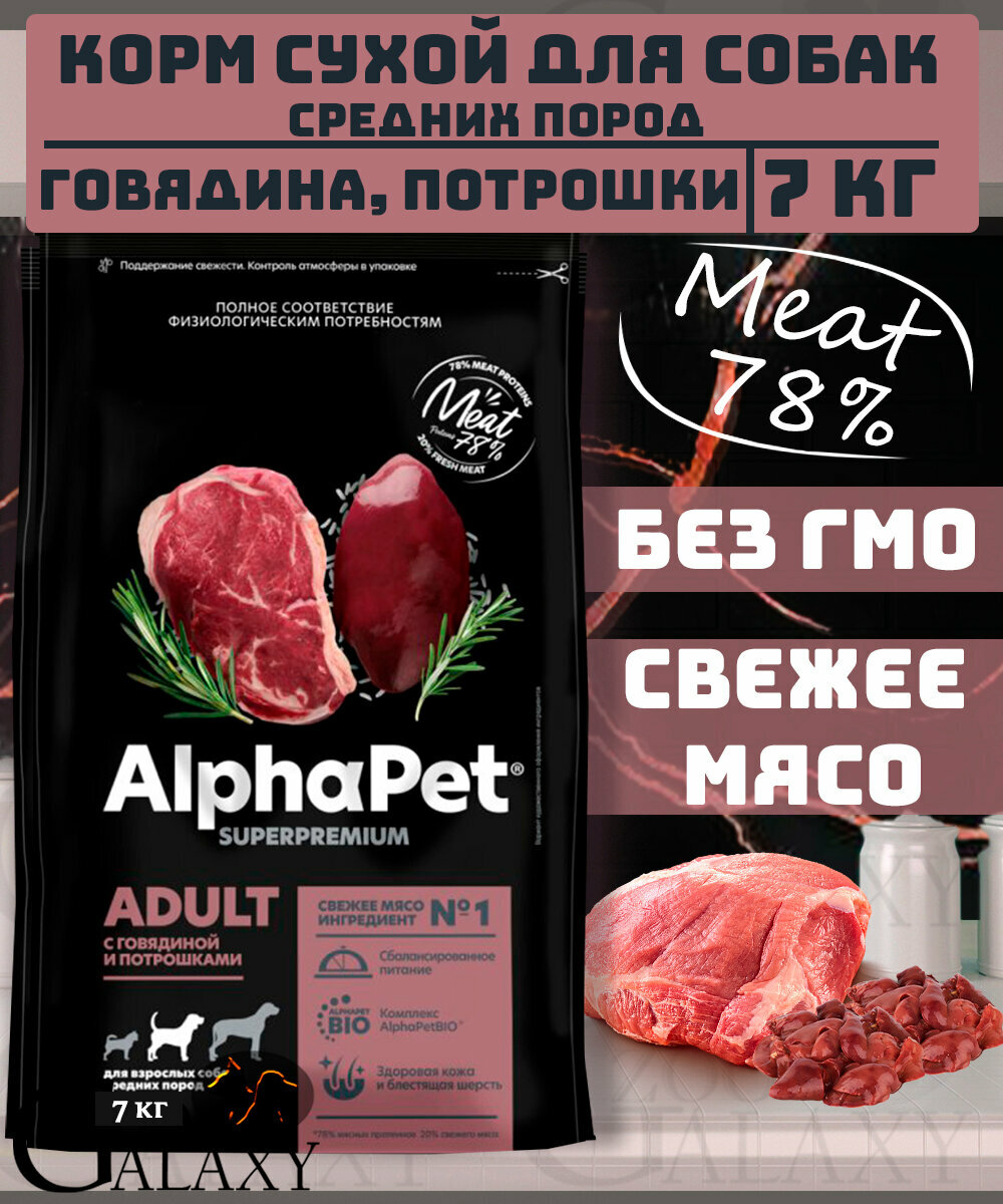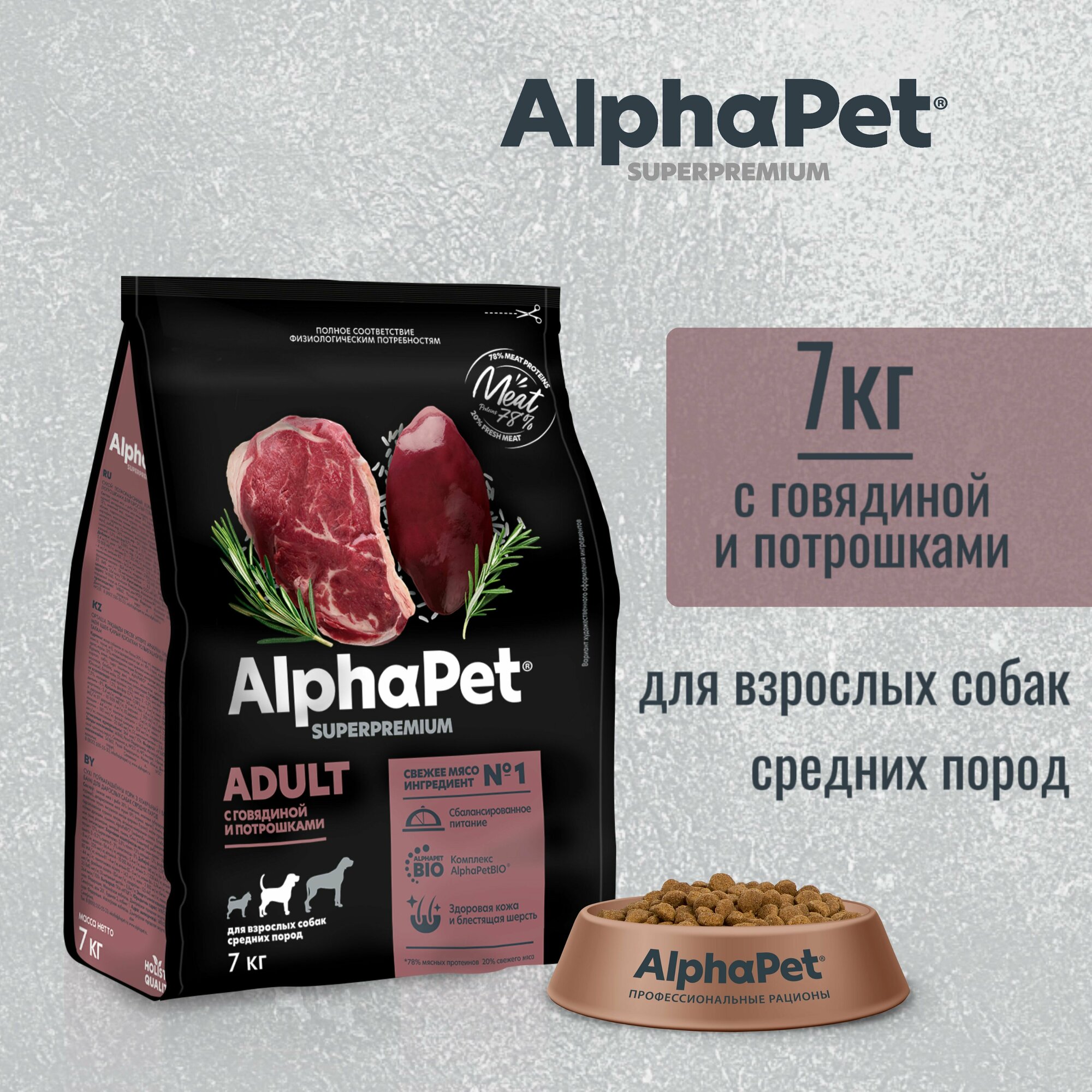 Сухой корм для собак средних пород AlphaPet Superpremium, с говядиной и потрошками, 7кг