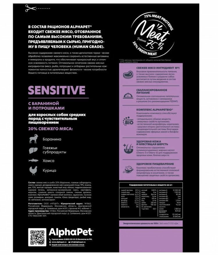 AlphaPet Superpremium Sensitive Medium Сухой корм для собак средних пород с чувствительным пищеварением Баранина и Потрошки 12кг
