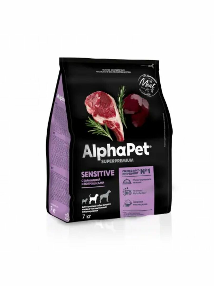 Сухой корм для собак средних пород AlphaPet Superpremium с чувствительным пищеварением полнорационный, с бараниной и потрошками, 7 кг