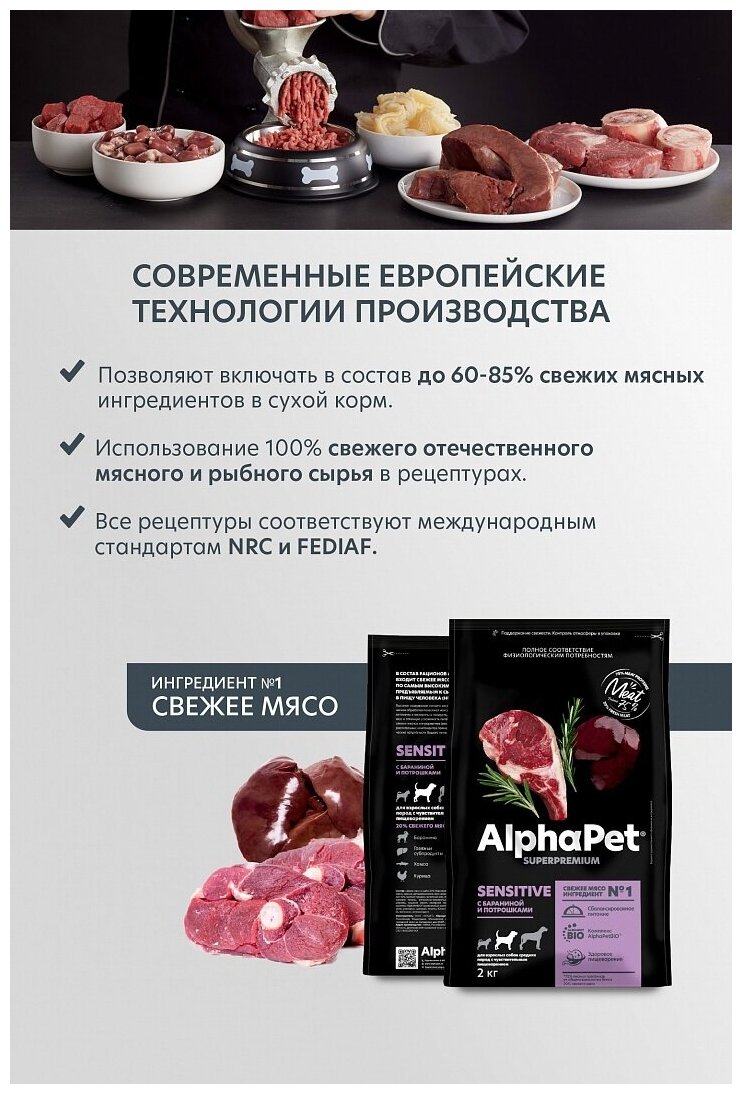ALPHAPET SUPERPREMIUM Сухой корм для собак с чувствительным пищеварением с Бараниной и Потрошками