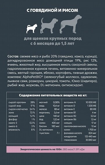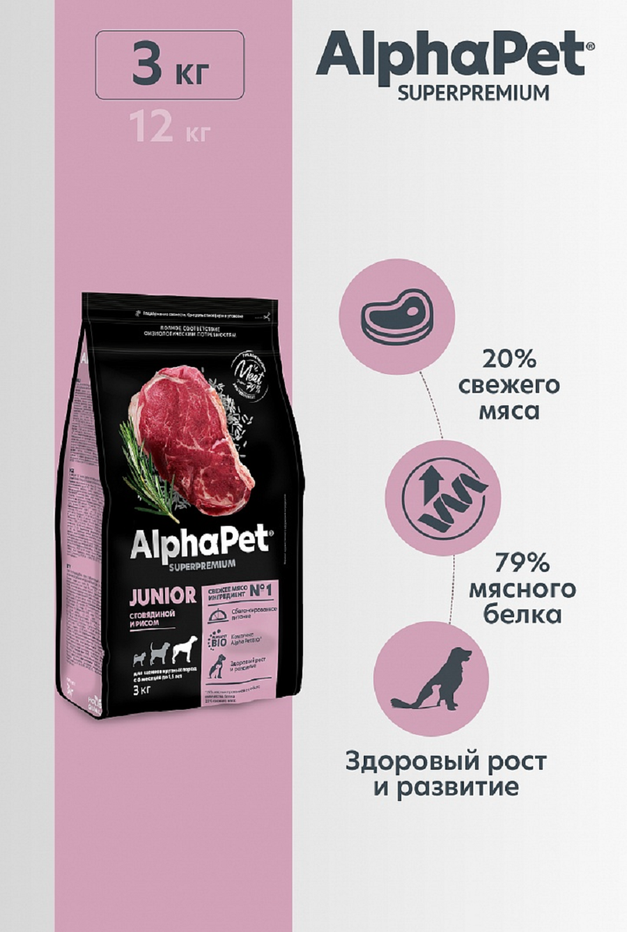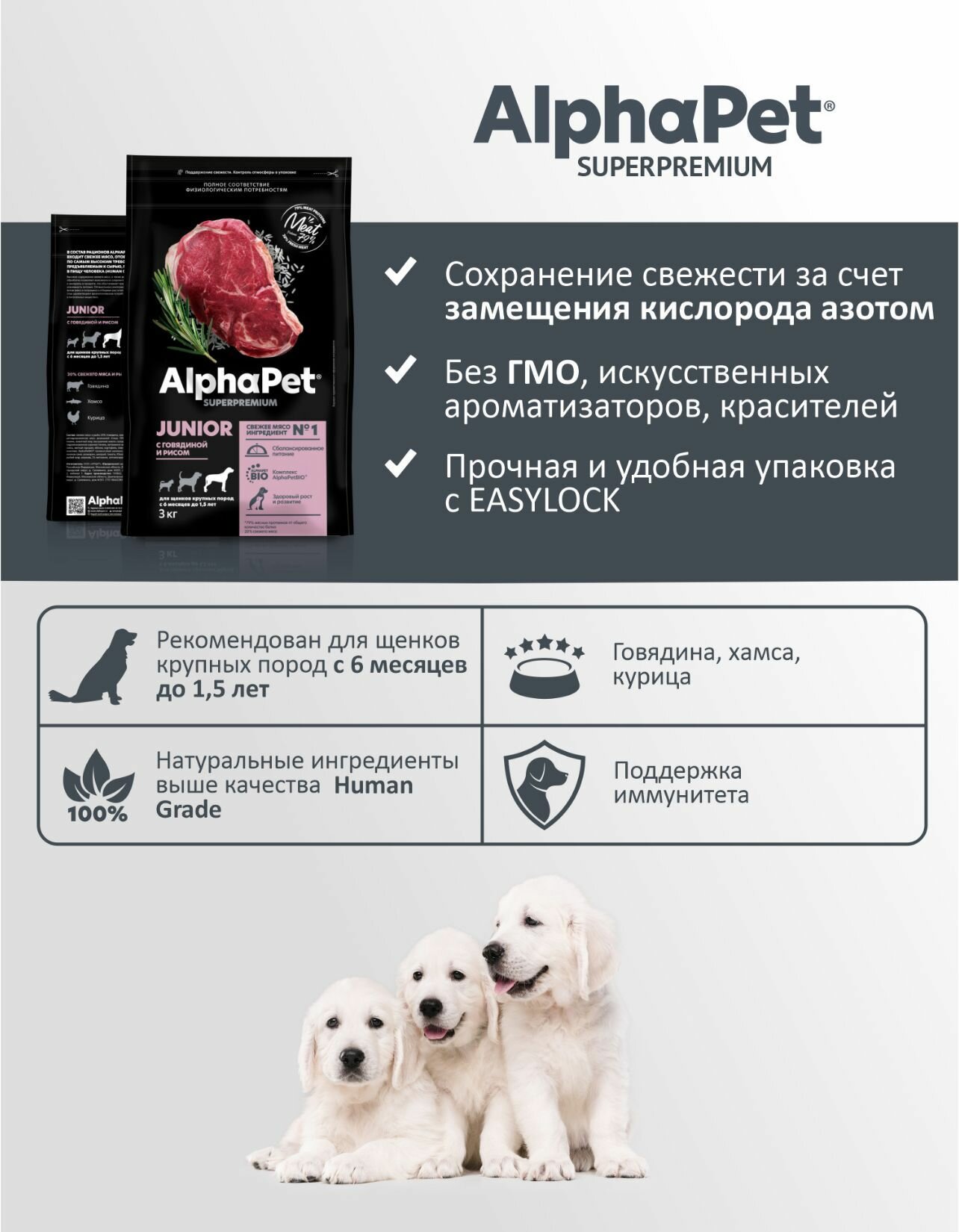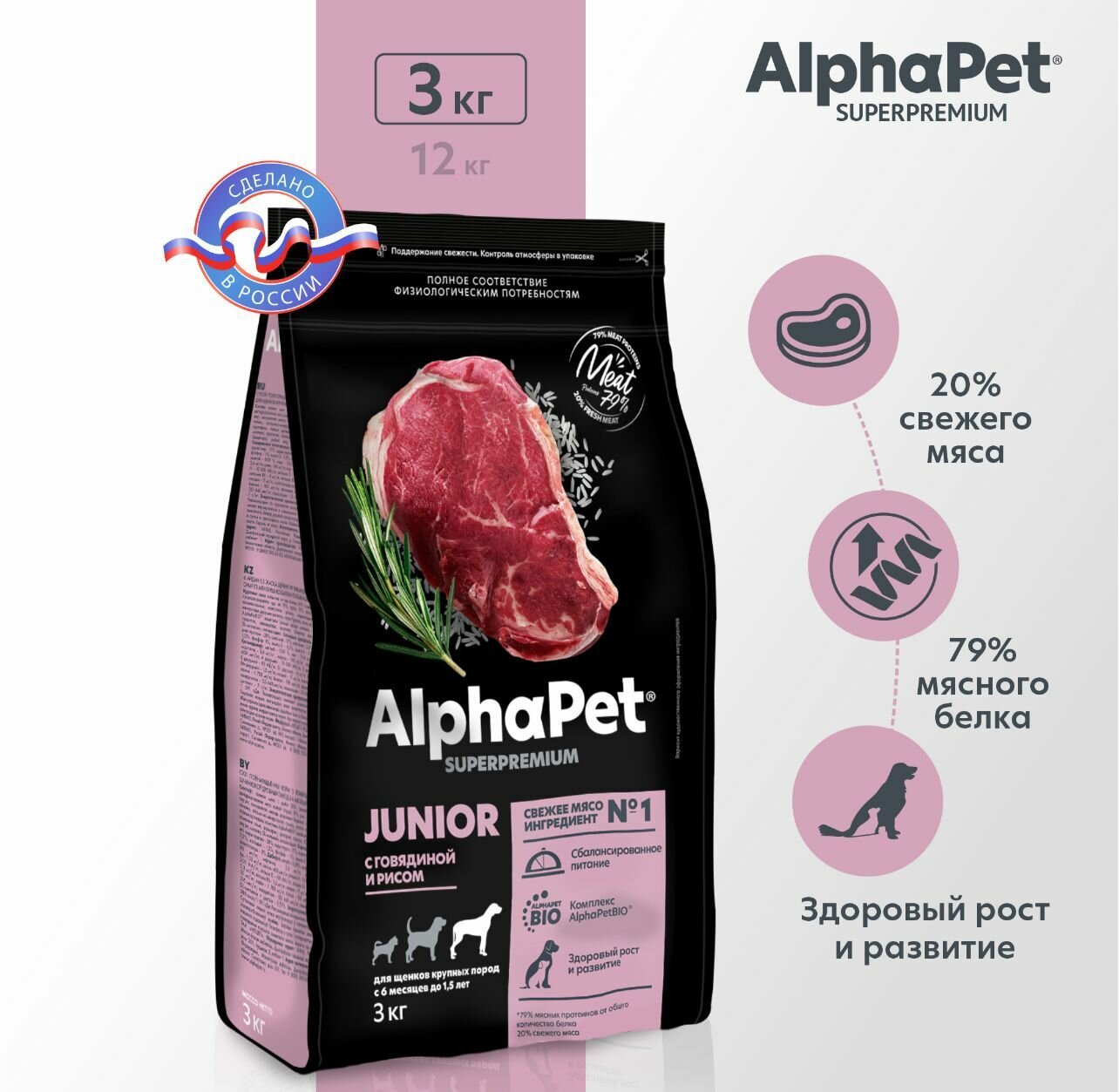 AlphaPet Superpremium - Сухой корм для щенков крупных пород с 6 месяцев до 1.5 лет, с Говядиной и Рисом (3 кг)