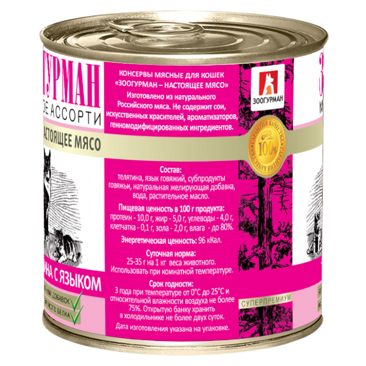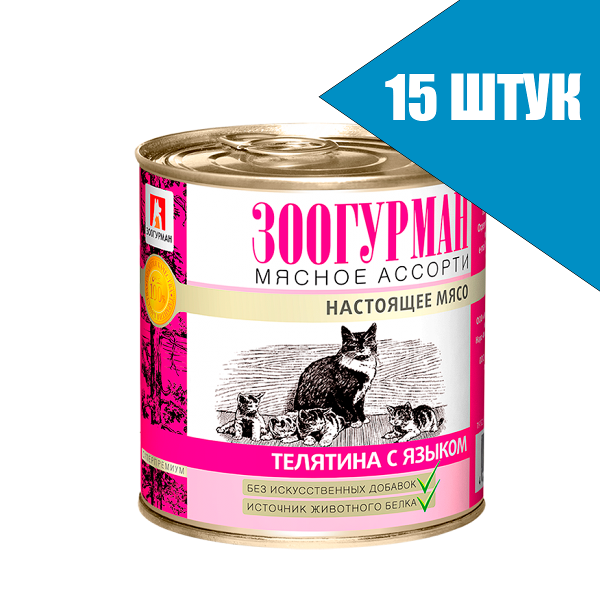 Зоогурман для кошек Мясное ассорти Телятина с языком, консервы 250г (15 банок)