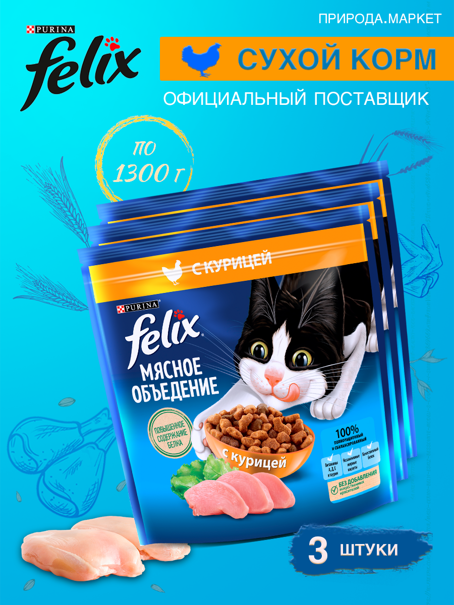Купить Сухой корм Felix для кошек с Курицей, 3 штуки по 1300 г