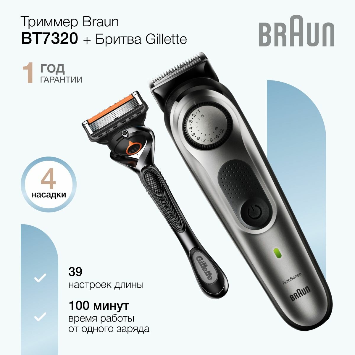 Триммер BRAUN BT5340, 2 насадки, бритва Gillette