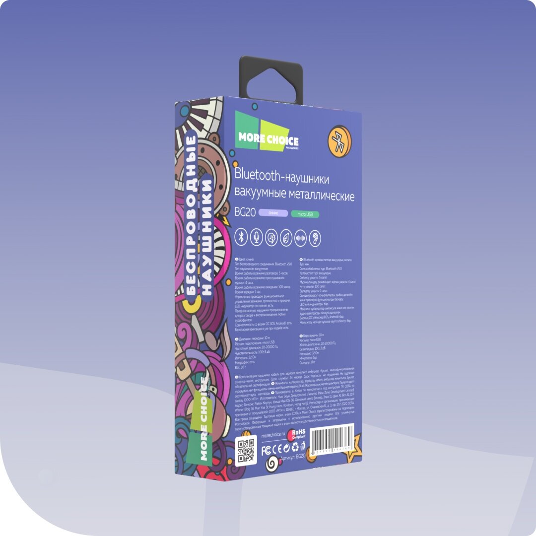 Беспроводные BLUETOOTH наушники More choice BG20 blue вакуумные с шейным шнурком