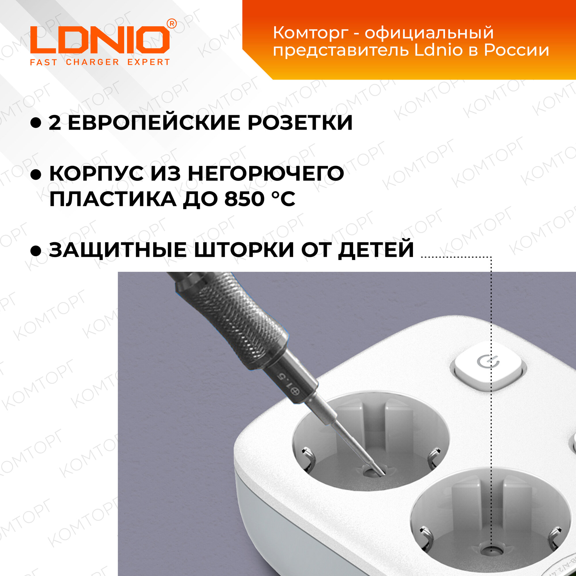 Сетевой фильтр LDNIO SE2435, 2 розетки, 10А / 2500 Вт white 120 мм 25 мм 50 мм