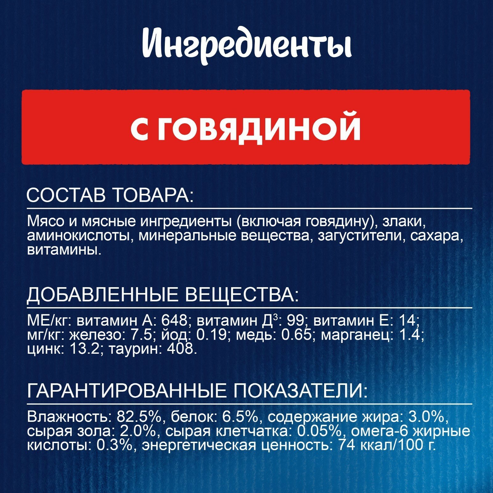 | Состав | мясо и мясные ингредиенты (включая курицу), экстракты растительного белка, аминокислоты, рыба и продукты ее переработки, масла и жиры, загустители, минеральные вещества, продукты переработки растительного сырья, сахара, витамины |