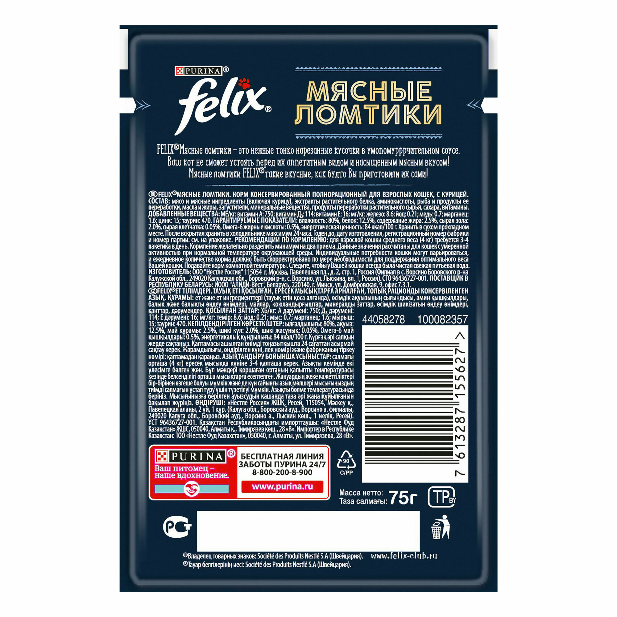 Влажный корм Felix Мясные Ломтики полнорационный для взрослых кошек, с курицей, 26шт.*75 г