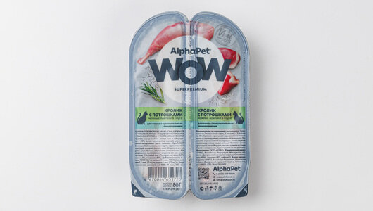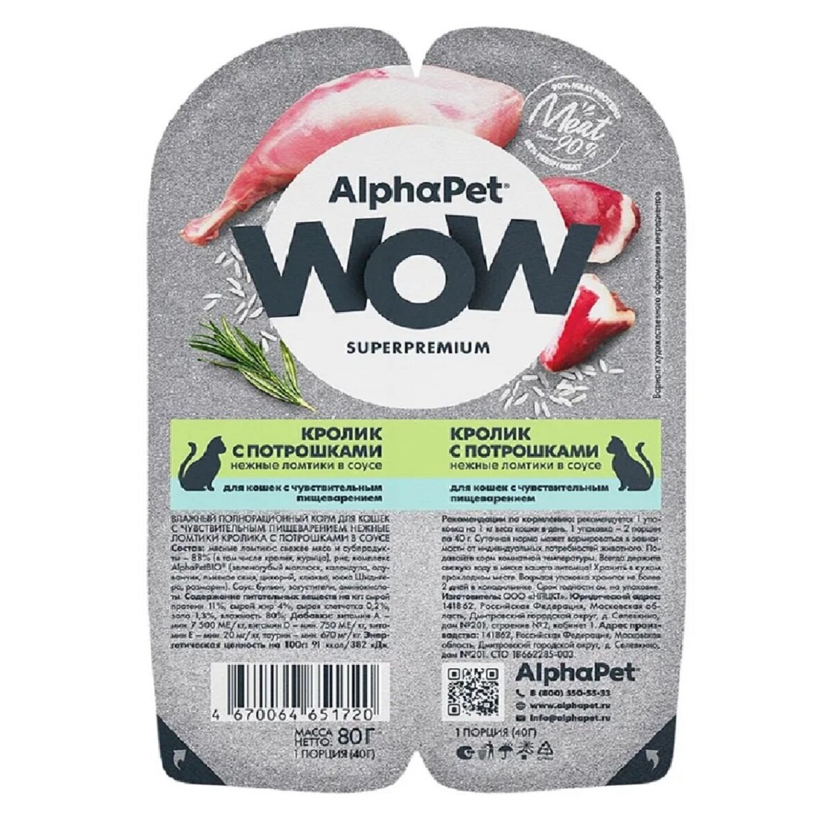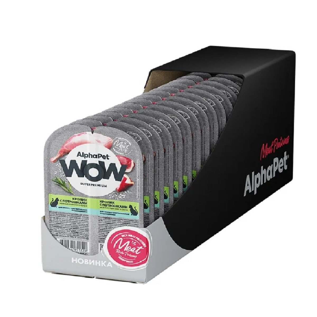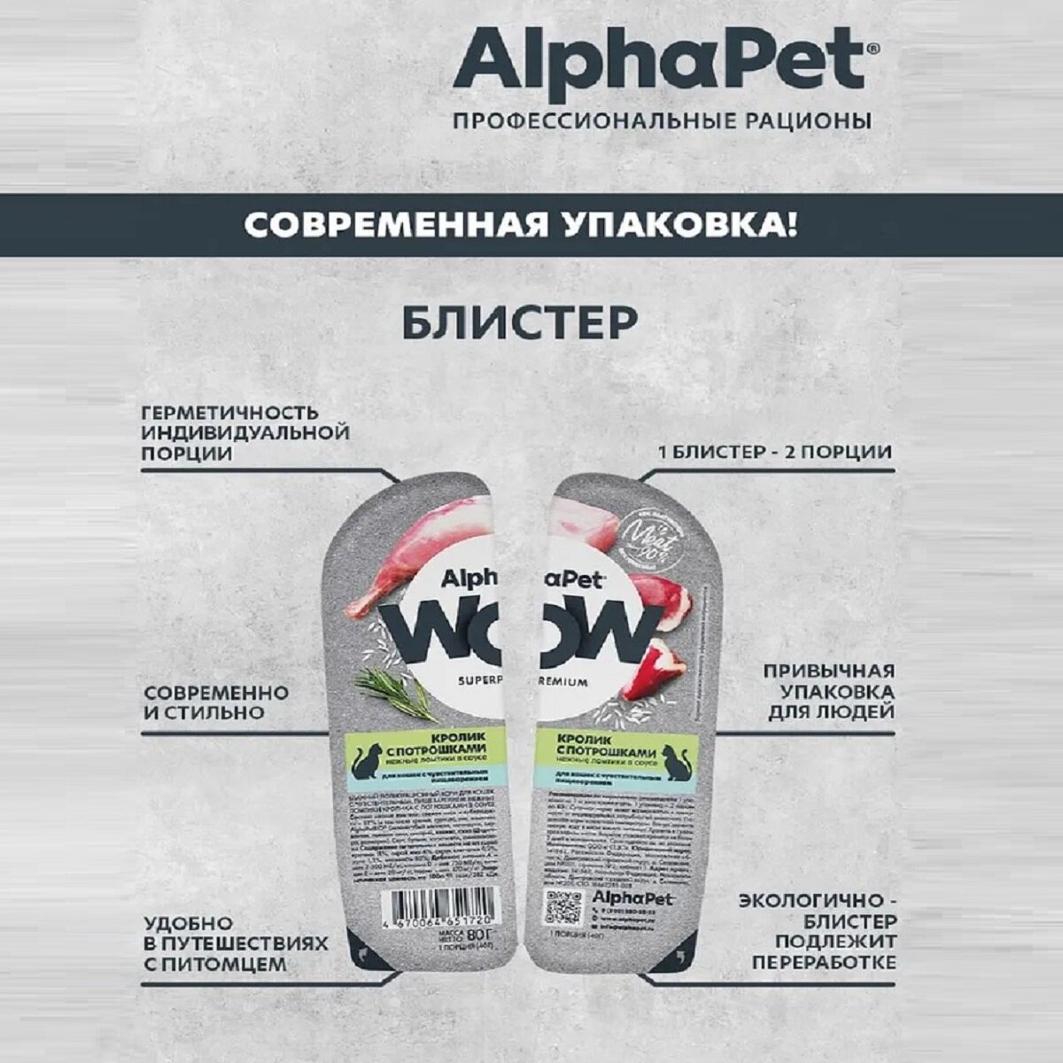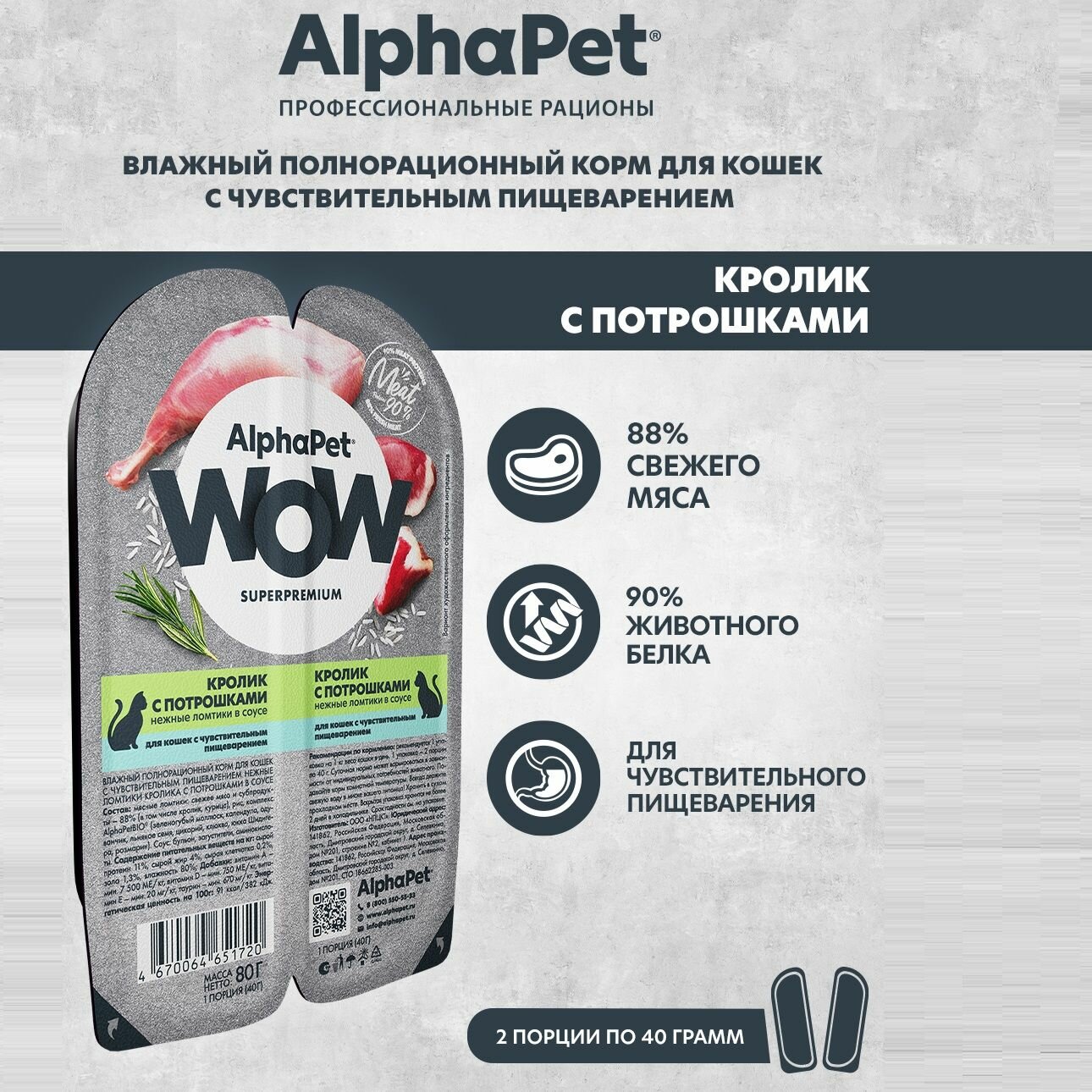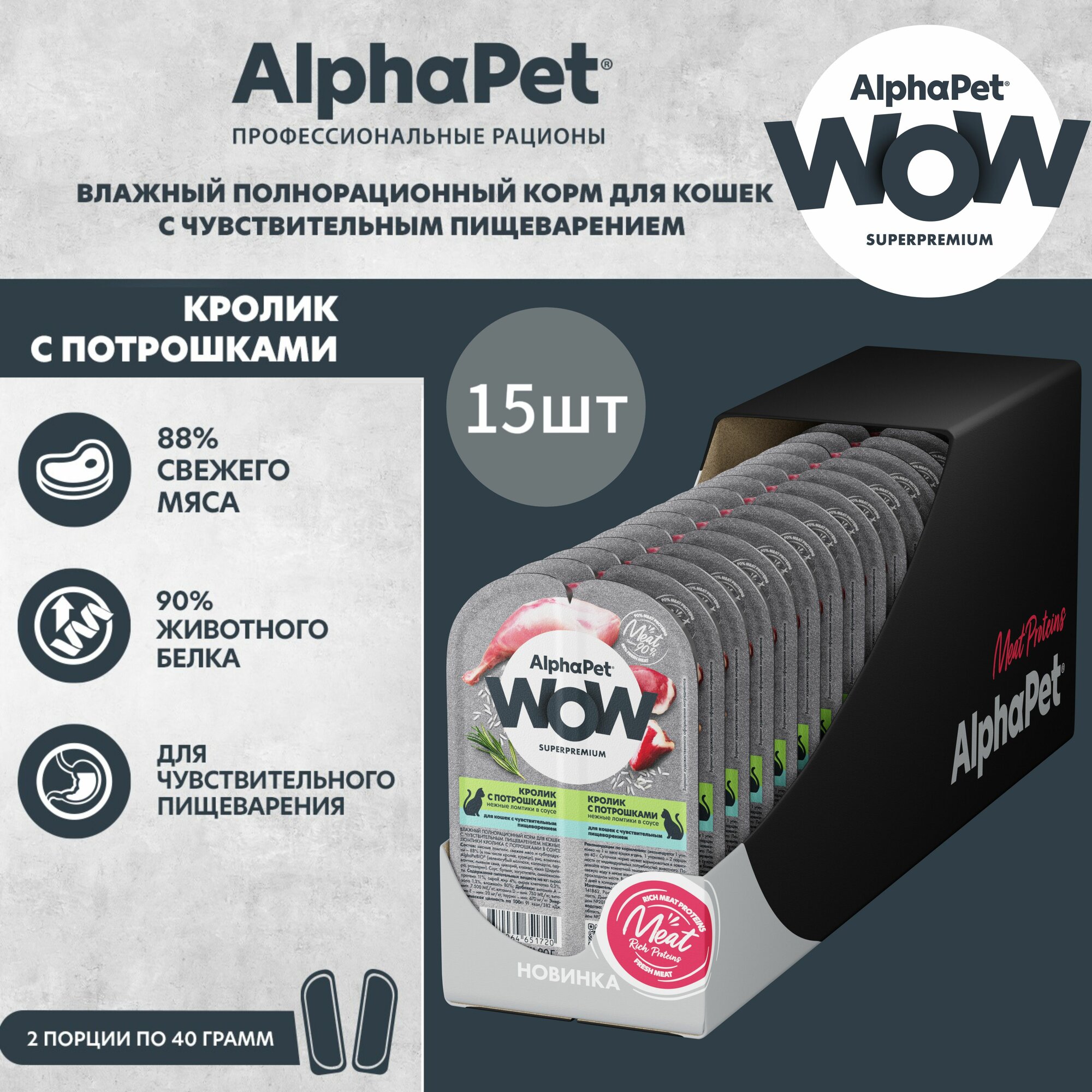 AlphaPet WOW 15шт по 80г корм для кошек c чувствительным пищеварением, кролик с потрошками сочные ломтики в соусе