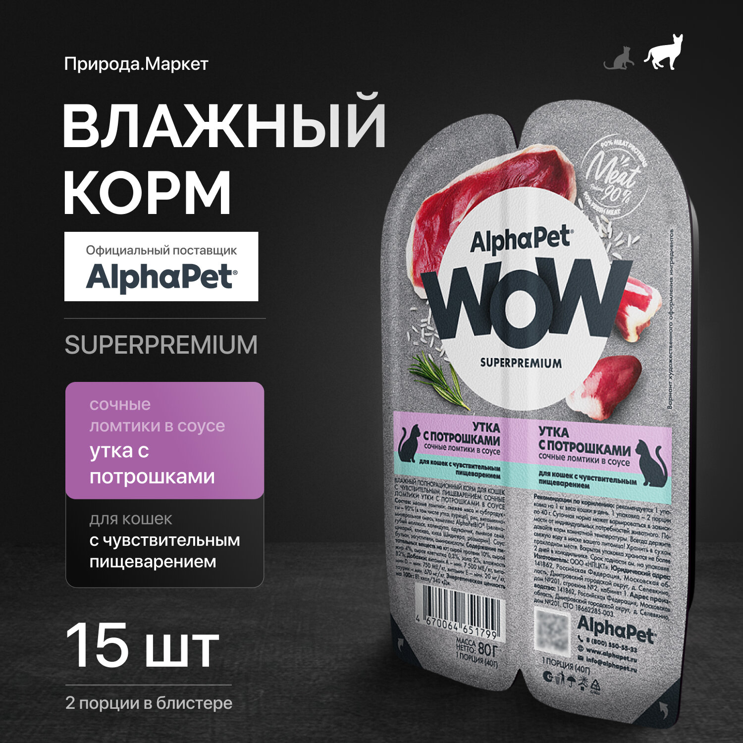 ALPHAPET WOW SUPERPREMIUM ламистер влажный корм для кошек с чувствительным пищеварением утка с потрошками 80г х 30шт