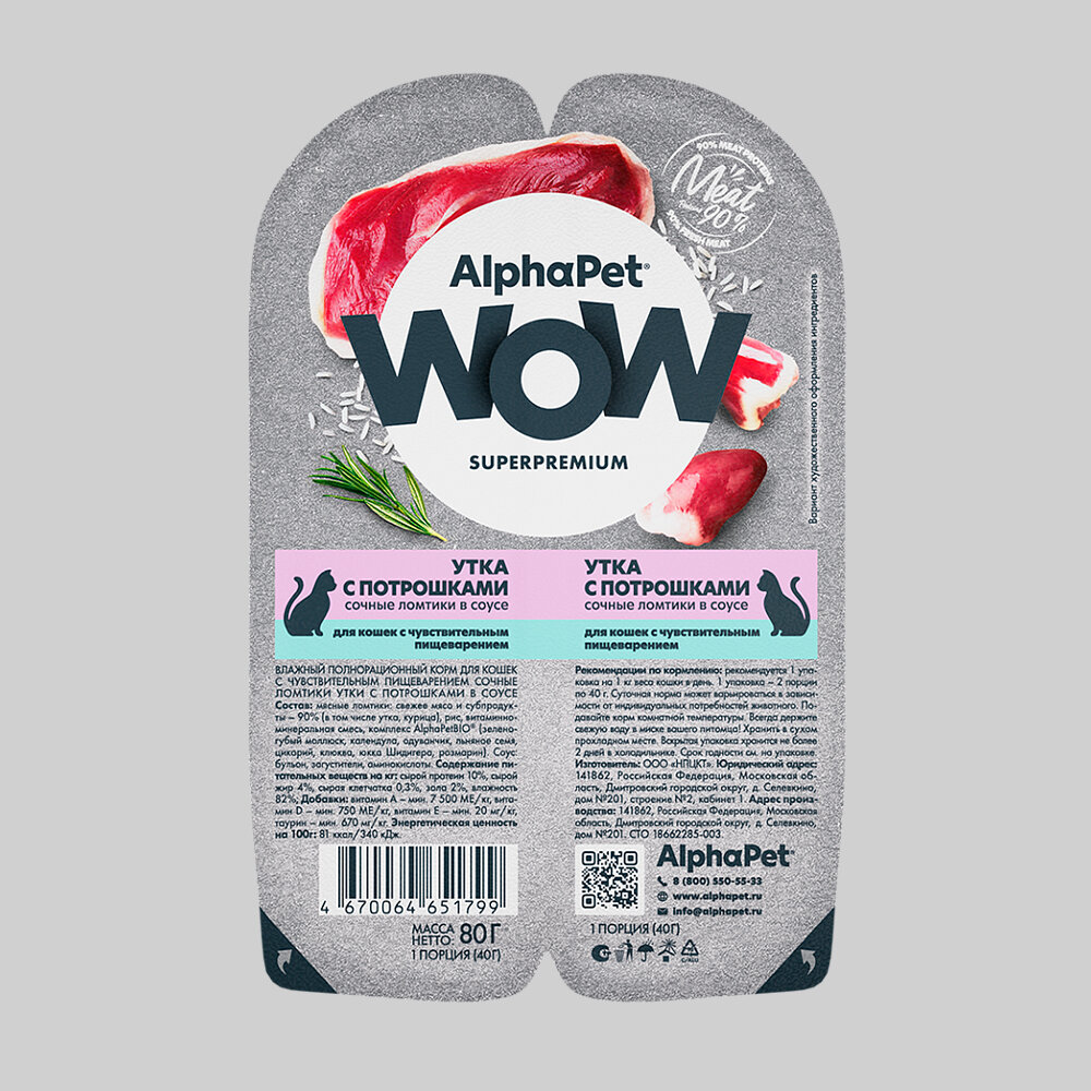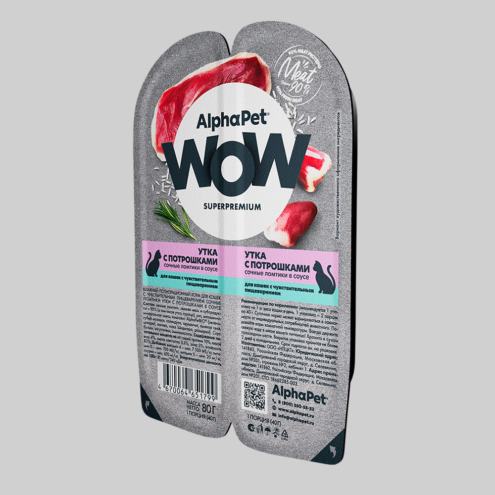 ALPHAPET WOW SUPERPREMIUM ламистер влажный корм для кошек с чувствительным пищеварением утка с потрошками 80г х 45шт