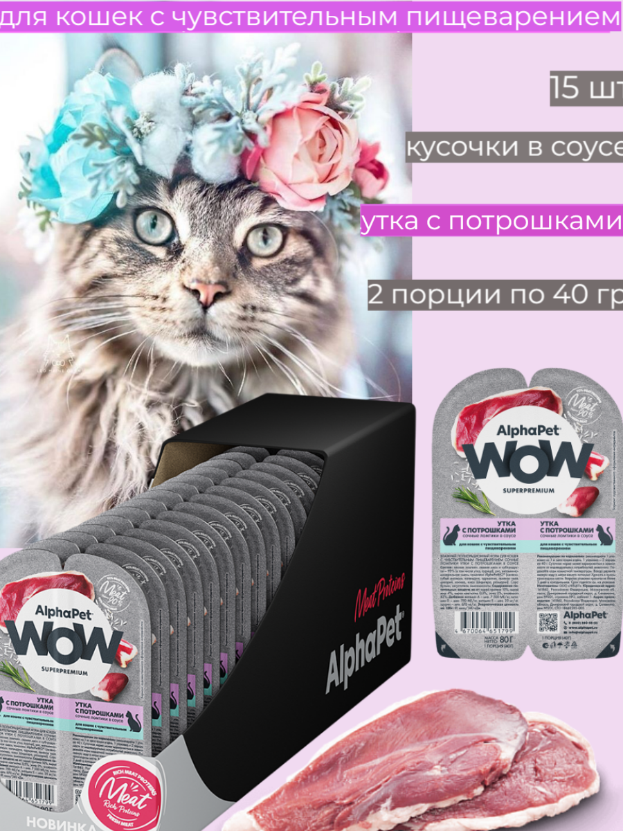 Купить Влажный корм для кошек с чувств. пищеварением AlphaPet WOW Superpremium Утка с потрошками сочные ломтики в соусе 80г (Упаковка 15 блистеров)