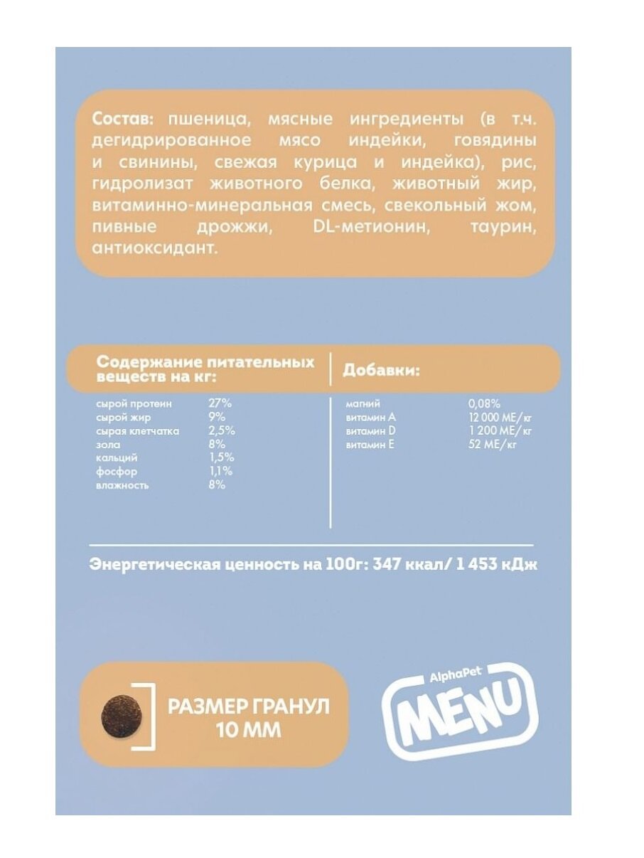 Сухой корм для кастрированных котов и стерилизованных кошек AlphaPet MENU с домашней птицей, 1,5кг