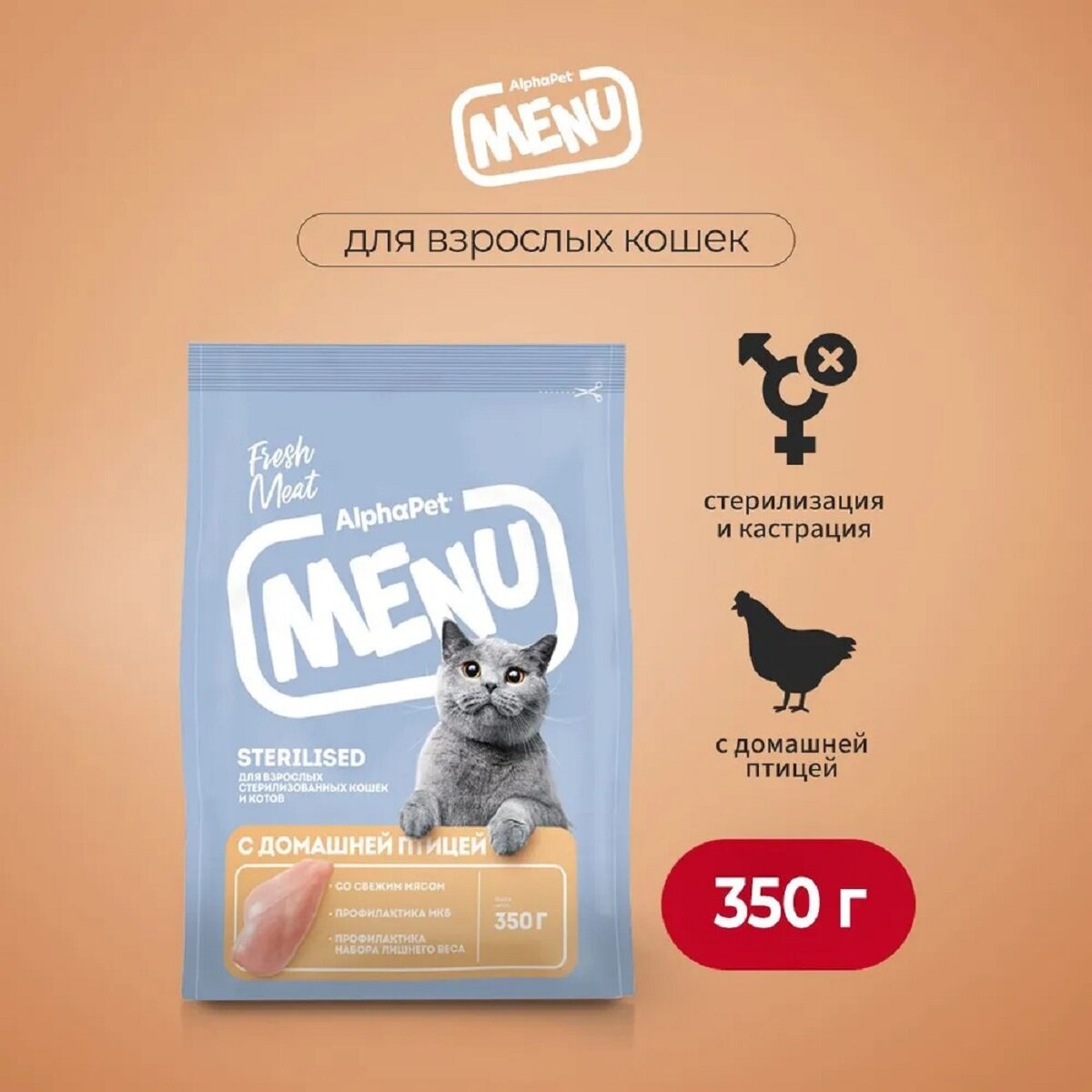 Купить Сухой полнорационный корм с домашней птицей для взрослых стерилизованных кошек и котов AlphaPet Menu 0,35кг