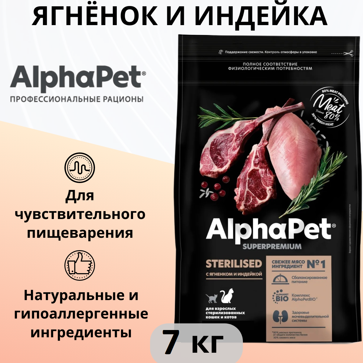 Сухой корм ALPHAPET SUPERPREMIUM для взрослых стерилизованных кошек и котов с ягненком и индейкой, 7 кг