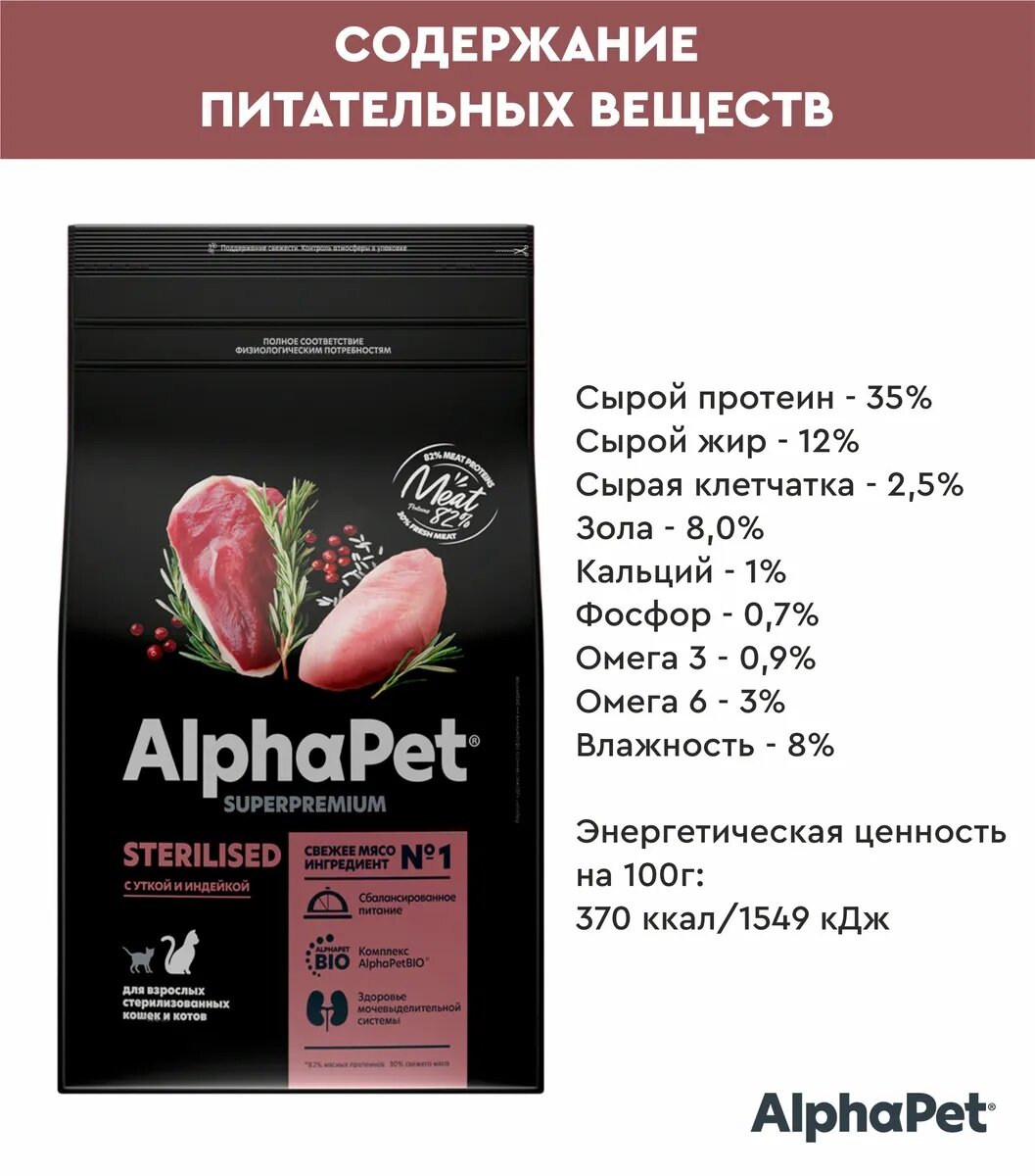 Сухой корм Alphapet Superpremium для взрослых стерилизованных кошек с уткой и индейкой, 1,5 кг