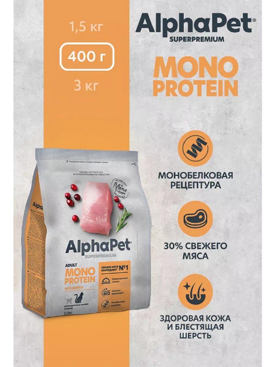 AlphaPet Monoprotein Superpremium Сухой корм для взрослых кошек, с индейкой, 400 гр.