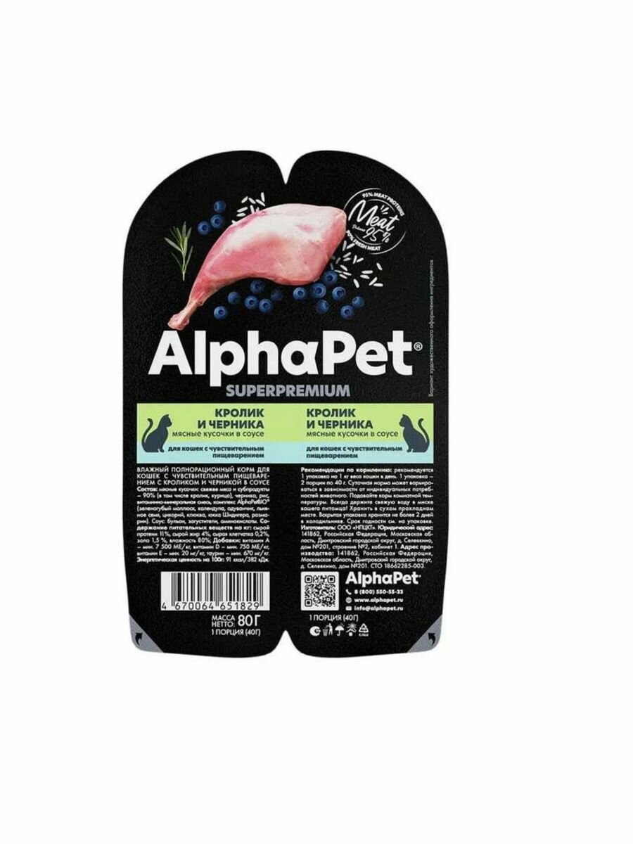 AlphaPet Superpremium паучи для кошек с чувствительным пищеварением кусочки в соусе Кролик и черника 80г (15 штук)