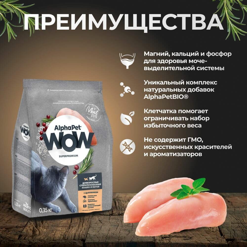Купить Корм сухой для стерилизованных кошек AlphaPet WOW с цыпленком, пак. 0,35кг