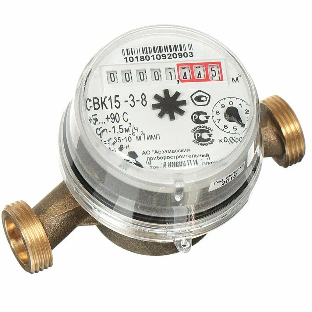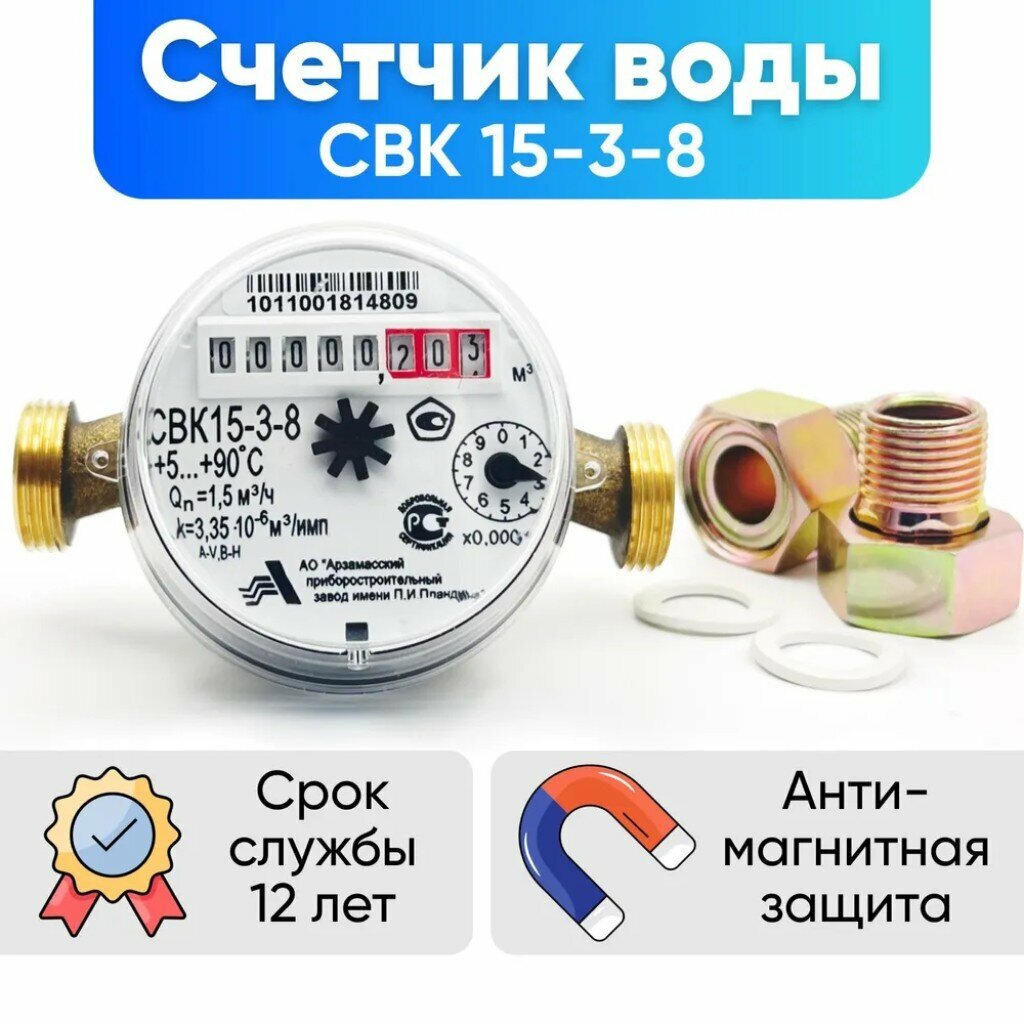 Счетчик воды универсальный для холодной и горячей воды Арзамас АПЗ СВК 15-3-8 с монтажным комплектом, поверка: июль 2023г.