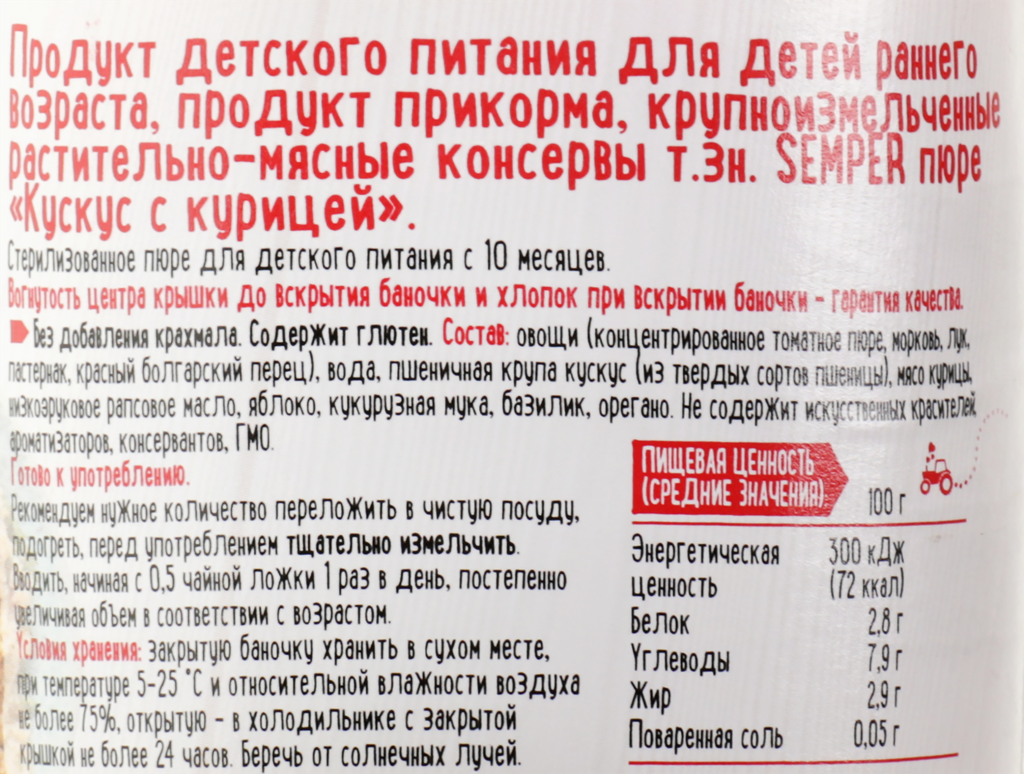 | Состав | Овощи (концентрированное томатное пюре, морковь, лук, пастернак, красный болгарский перец), вода, пшеничная крупа кускус (из твердых сортов пшеницы), мясо курицы, низкоэруковое рапсовое масло, яблоко, кукурузная мука, базилик, орегано |