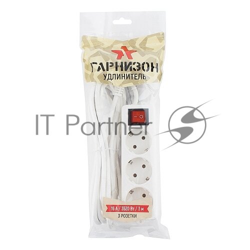 Удлинитель Гарнизон ELB-G3-W-3, 3 евророзетки с выключателем и заземлением, допустимый ток 16А, длина 3м.